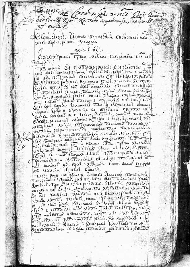 Доношение купца Максима Походяшина в канцелярию Главного заводов правления о найденных на севере Верхотурского уезда залежей медных и железных руд. 1757 г. ГАСО. Оп. 12. Д. 3125. Л. 23-24.