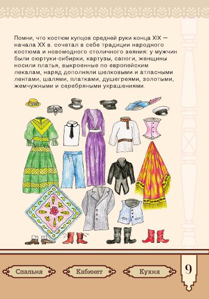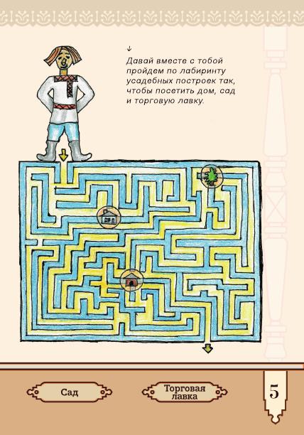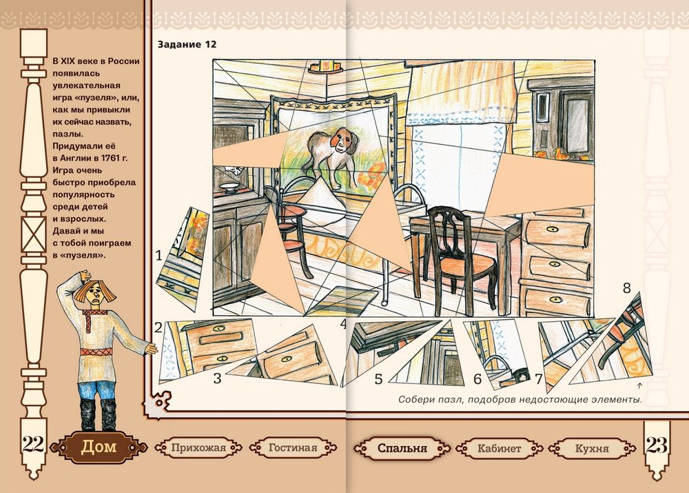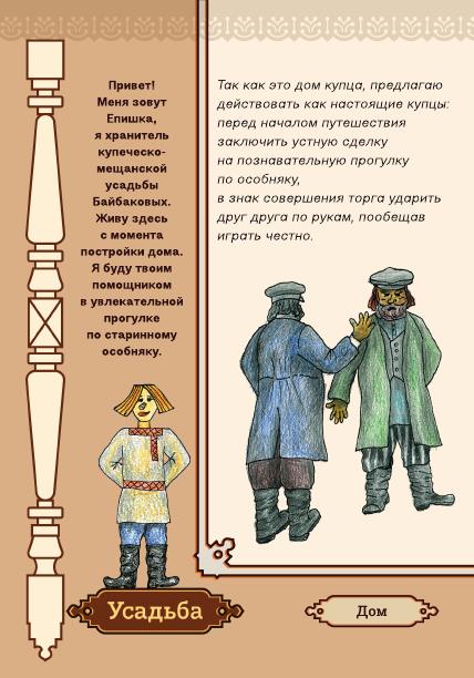 С помощью путеводителя, являющегося результатом совместной работы экспозиционера Елены Гончаровой и художника музея-заповедника Геннадия Иванова, дети раскроют свои интеллектуальные и творческие способности, а также потренируют школьные навыки. Юные посетители дорисуют и раскрасят интерьер купеческой гостиной, отыщут в необычном кроссворде-ребусе предметы мебели, а на картинках с отличиями – старинную кухонную утварь. Познавательная брошюра расскажет, откуда и в каком году в Россию пришла игра «пузеля», которую современники называют пазлами. Ребята прочтут о любимых настольных играх купцов, узнают, как представители этого сословия любили пить чай, чем знаменит епифанский купец Оводов в шашечном мире.