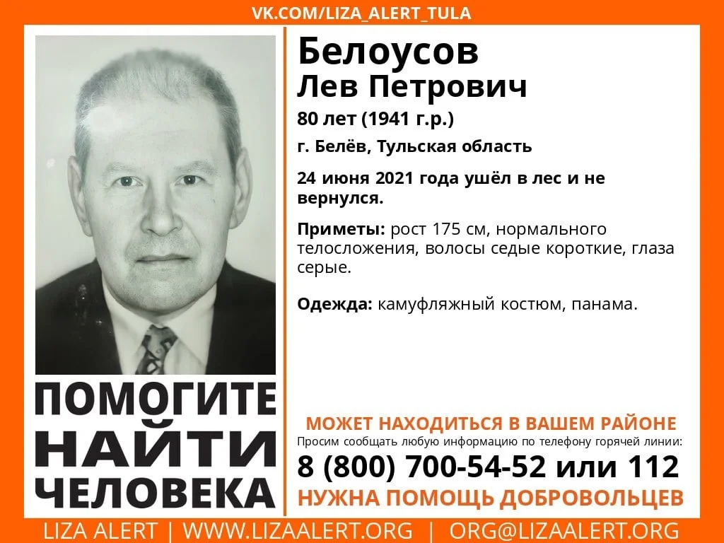 Поисково-спасательный отряд "ЛизаАлерт" просит помощи в поисках пропавшего человека. 80-летний Лев Петрович Белоусов из Белёва, Тульская область, ушел в лес 24 июня и не вернулся.