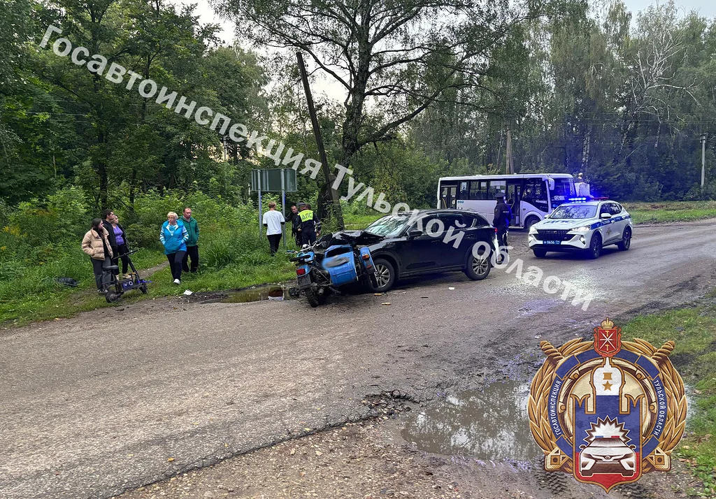 По информации тульской Госавтоинспекции, ДТП произошло около 18:59. 41-летний водитель мотоцикла УРАЛ ИМЗ-8.10330 без водительских прав, не справившись с управлением, выехал на встречную полосу, где совершил протаранил автомобиль Mazda, за рулем которого находился 32-летний мужчина.