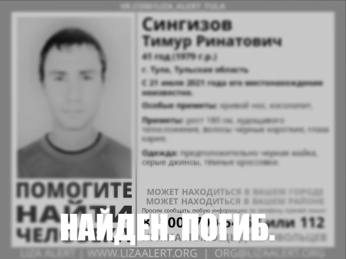 41-летнего туляка Тимура Сингизова, который был объявлен в розыск волонтёрами отряда «ЛизаАлерт», нашли погибшим вчера, 18 августа. Об этом волонтеры сообщили в группе под записью о поиске мужчины.
