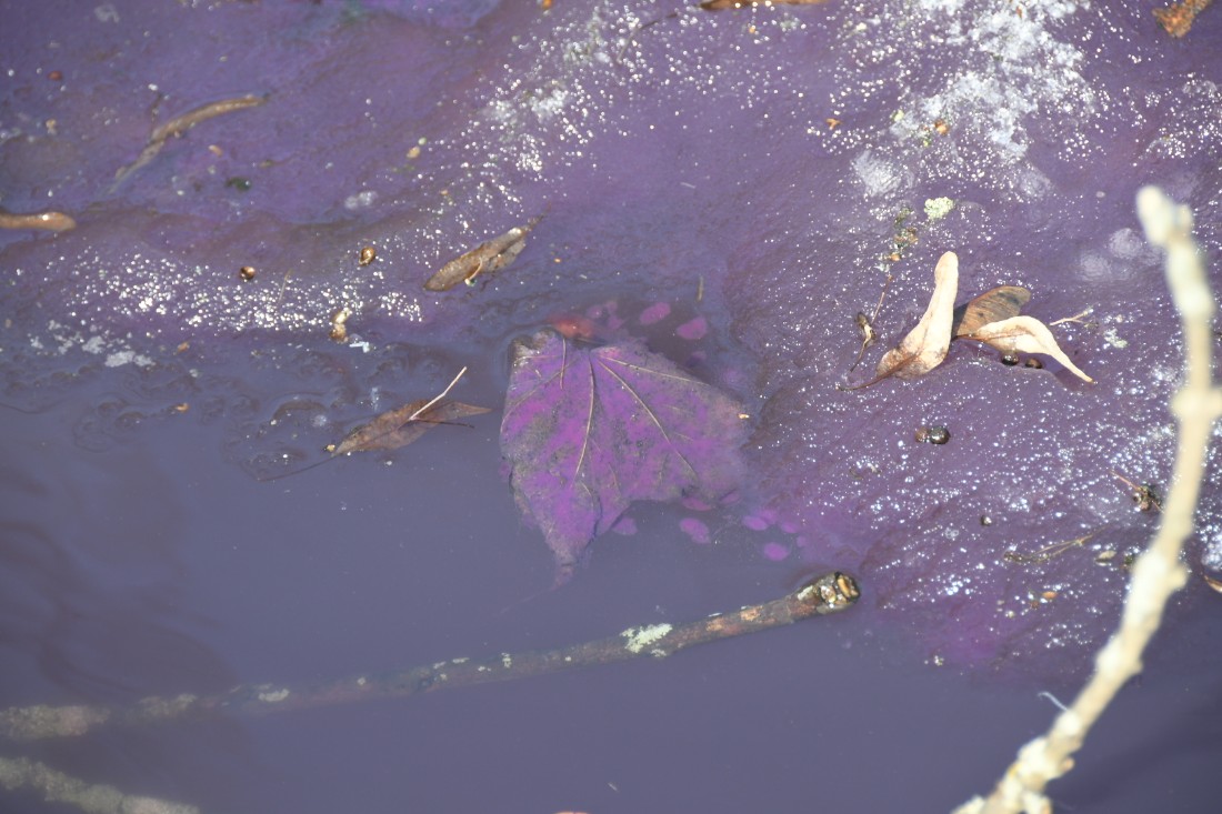 Сотрудники музея поясняют: фиолетовый цвет пруду придает пигмент, попадающий в воду из опавших листьев канадского клена, и экологической опасности это не несет ни пруду, ни его обитателям.
