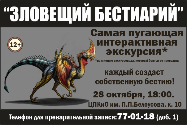 Посетителям расскажут о василисках, драконах, фениксах, арахнидах, диковинных птицах и других малоизученных животных, набравших популярность в период средневековья, самые страшные анималистические мифы, про зловещих зверей, часть которых мирно живет в нашем экзотариуме.