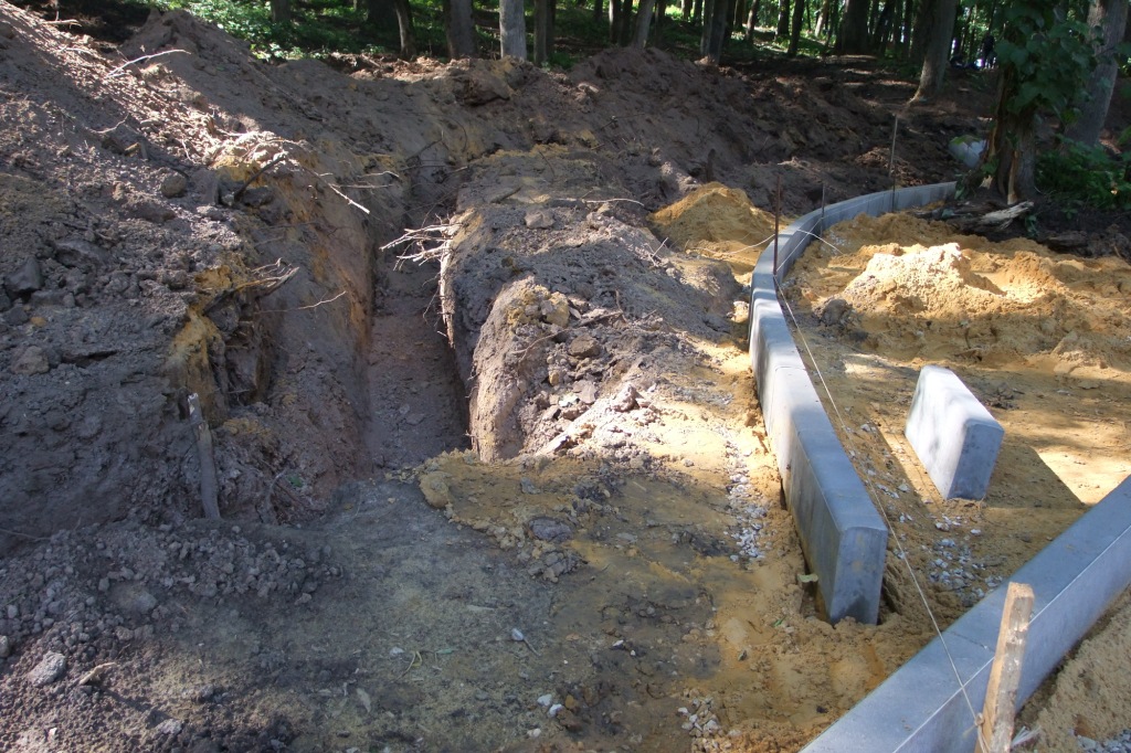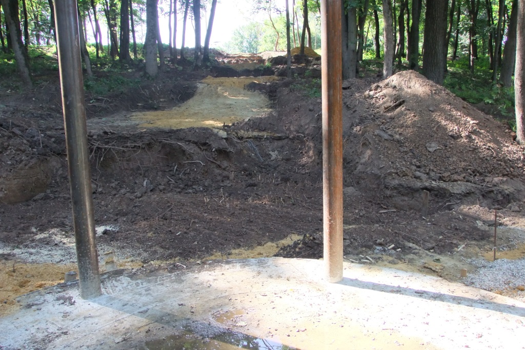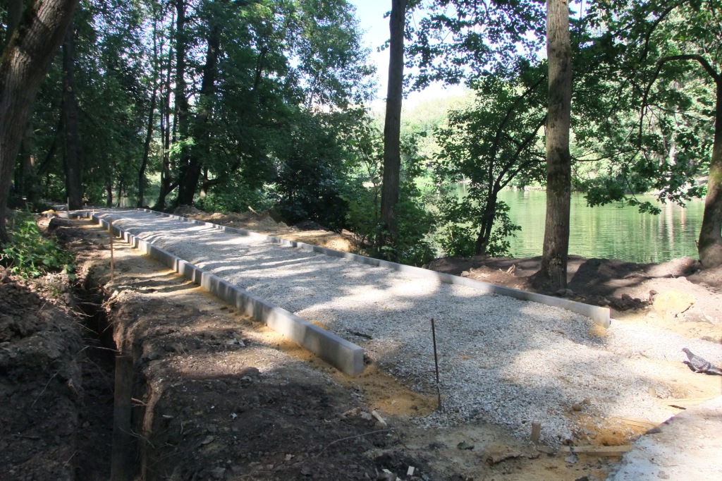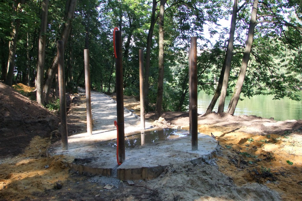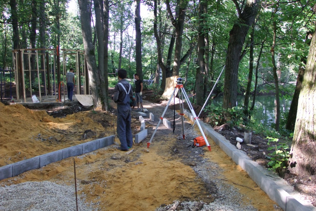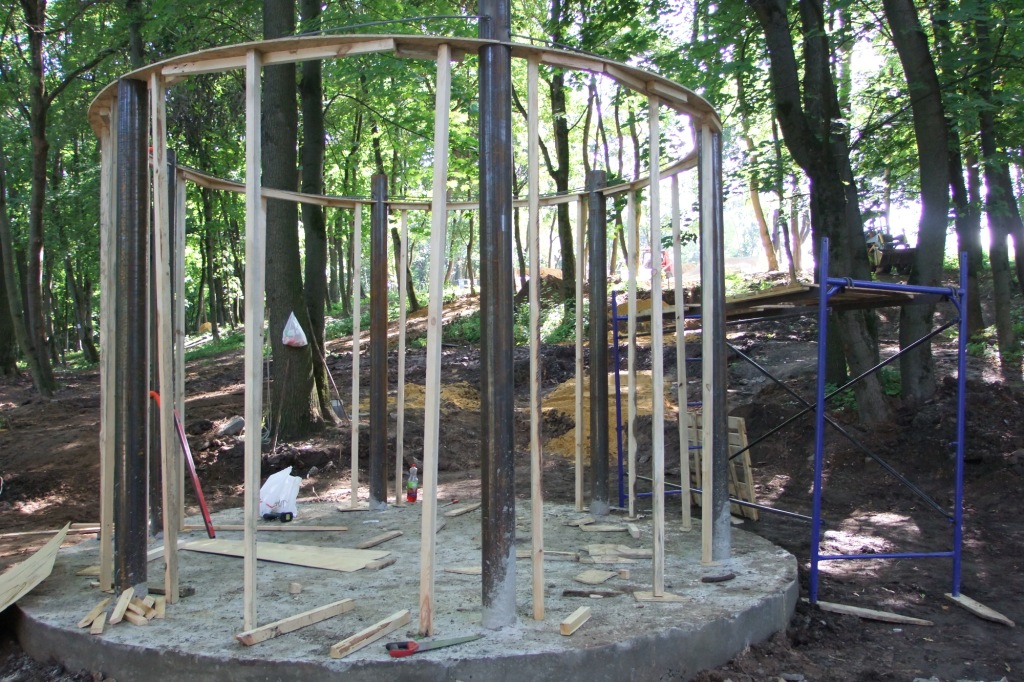 По всему лесу сейчас разносятся звуки электропилы, гудение тракторов, подъемников и т.д. На другом берегу развернулась бурлящая активность. Кругом ходят строители, все перекопано. А на привычных местах можно увидеть непривычные объекты. Такие как, например, будущие ротонды.
