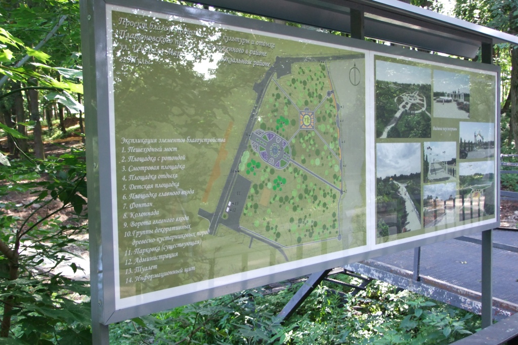 План благоустройства парка представлен на стендах, к которым постоянно подходят люди. Интересуются. И, действительно, есть чем. Красивые фото плана обещают многое. Согласно проекту, в Платоновском лесу появится две зоны: зона культуры и отдыха и зона природы и прогулок.