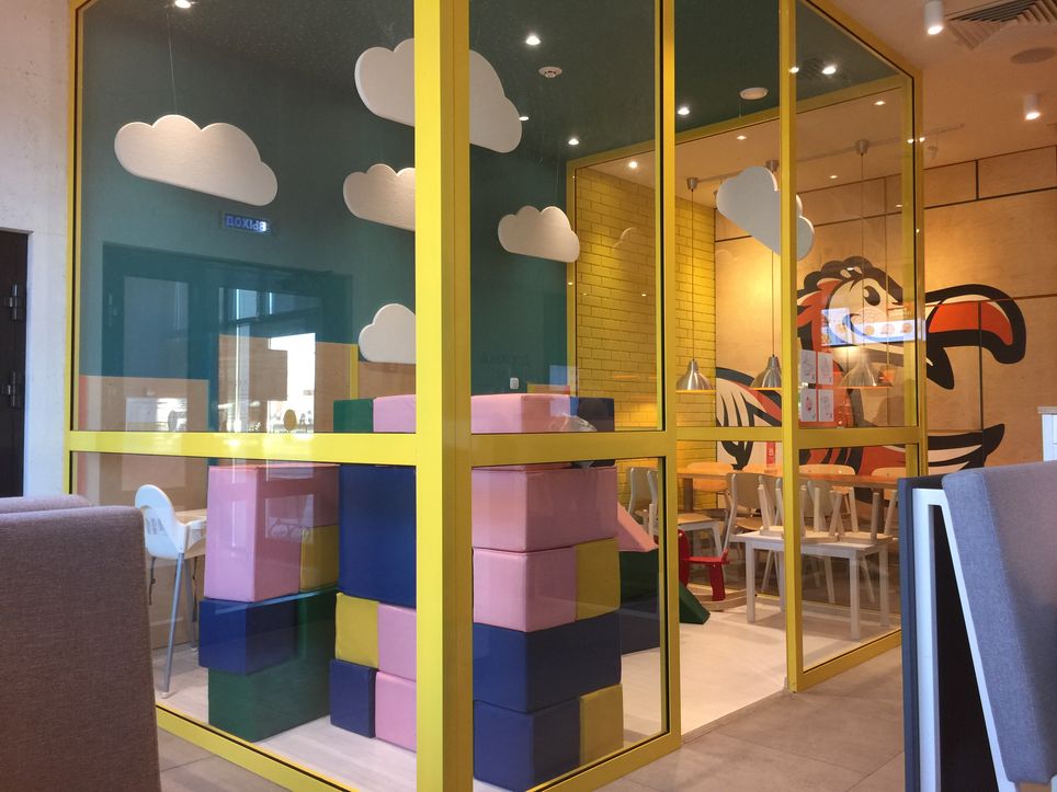 Помещение кафе оформлено в светлых тонах. Просто, но со вкусом. Предусмотрена и детская комната. Но расположение мебели здесь довольно неудобное. Вокруг колонн в центре зала и перегородок, декорированных под кирпич, скопились диваны и столики. Создается ощущение нагроможденности Все это похоже на своего рода лабиринт, в котором не хочется находиться долгое время.