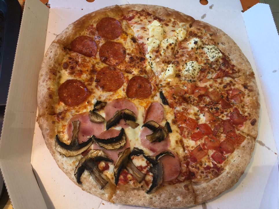 Меню не богатое, но и есть, из чего выбирать. Здесь и 22 вида пиццы, картофель, салаты, курица, напитки, десерты и даже горячая кукуруза. Наш выбор пал на пиццу «Четыре сезона» (495 руб): томатный соус, орегано, кубики брынзы, шампиньоны, томаты, ветчина, пикантная пепперони и моцарелла. Разбита пицца на четыре части, каждая из которых со своим вкусом. Из напитков выбрали зеленый чай (55 руб) и капучино (95 руб). На десерт заказали рулетики: одни с сыром, другие — сладкие, с корицей. Итого наш чек составил 885 руб.