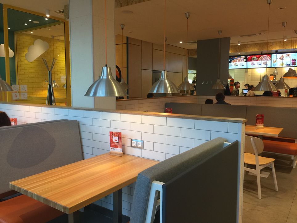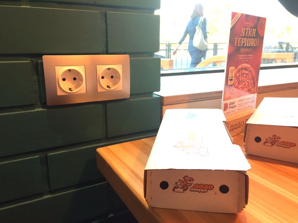 С чаем и подносом отправились за столик, ждать кофе, пиццу и рулетики. Отслеживали приготовление своего заказа по табло на стене. Как только там загоралось имя, предварительно названное кассиру, можно было отправляться за блюдом. Рядом с каждым столиком две розетки. Это большой плюс в нашем современном мире.