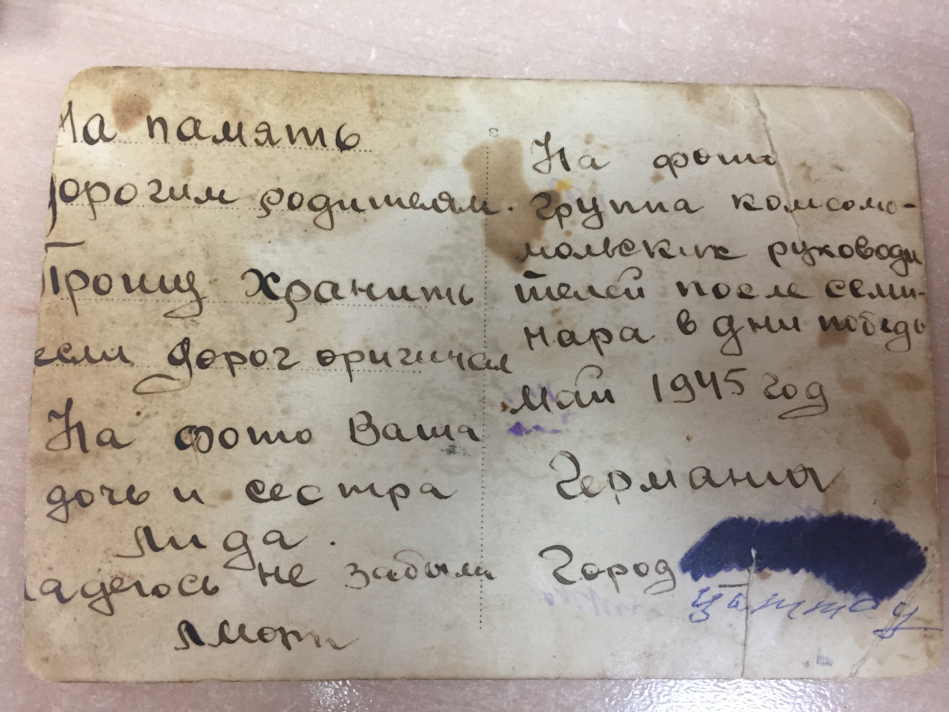 А еще Лидия Алексеевна работала комсоргом (комсомольский организатор - ред.), посещала семинары, которыми руководил «капитан из Тулы Александр». Память о последнем семинаре «Добьем фашистского зверя в его собственной берлоге» Лидия Алексеевна хранит до сих пор. У нее остался снимок, которым она любезно делится с молодым поколением.