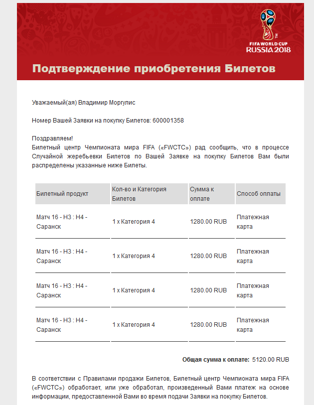 И вот, спустя некоторое время томительного ожидания мне пришло подтверждение о том, что на один из заявленных матчей я все-таки попаду. 30 октября мне сообщили в письме о том, что 19 июня я смогу посетить матч в Саранске. Поеду туда с друзьями.