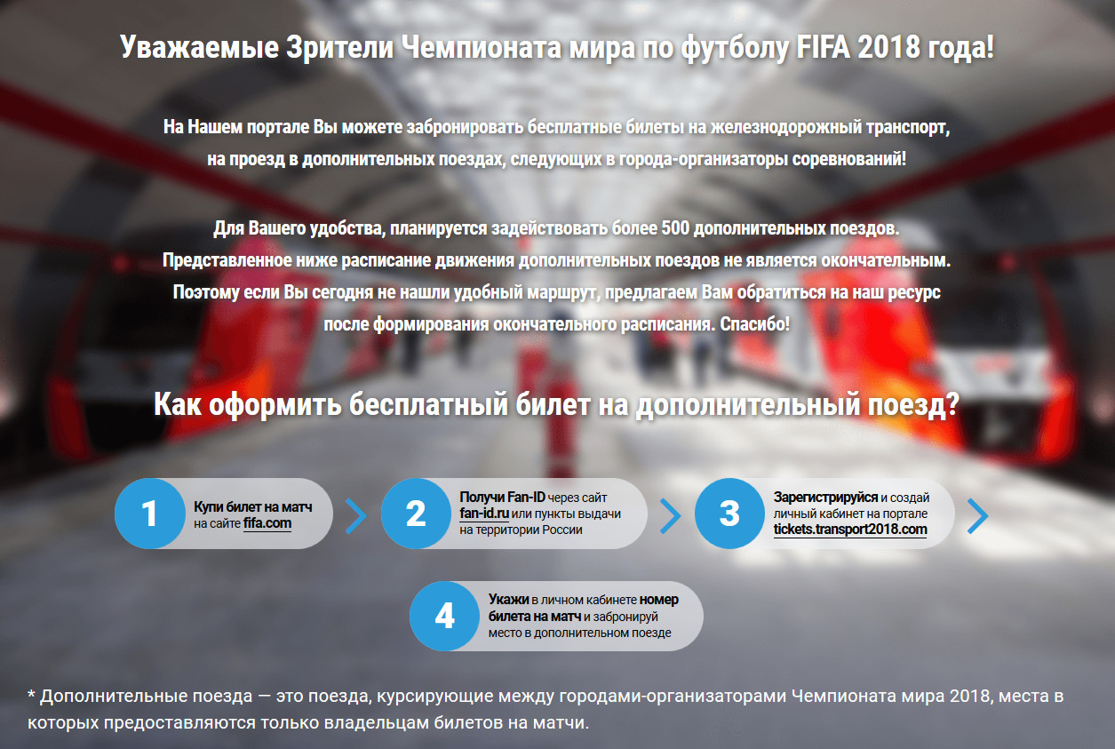 Однако попасть на этот поезд сможет лишь тот, кто имеет билет и паспорт болельщика. У меня, к счастью, есть и то, и другое. Теперь дело техники и Интернета. Заходим на сайт tickets.transport2018.com — там все понятно интуитивно, как и на всех остальных официальных сайтах, связанных с ЧМ-2018.