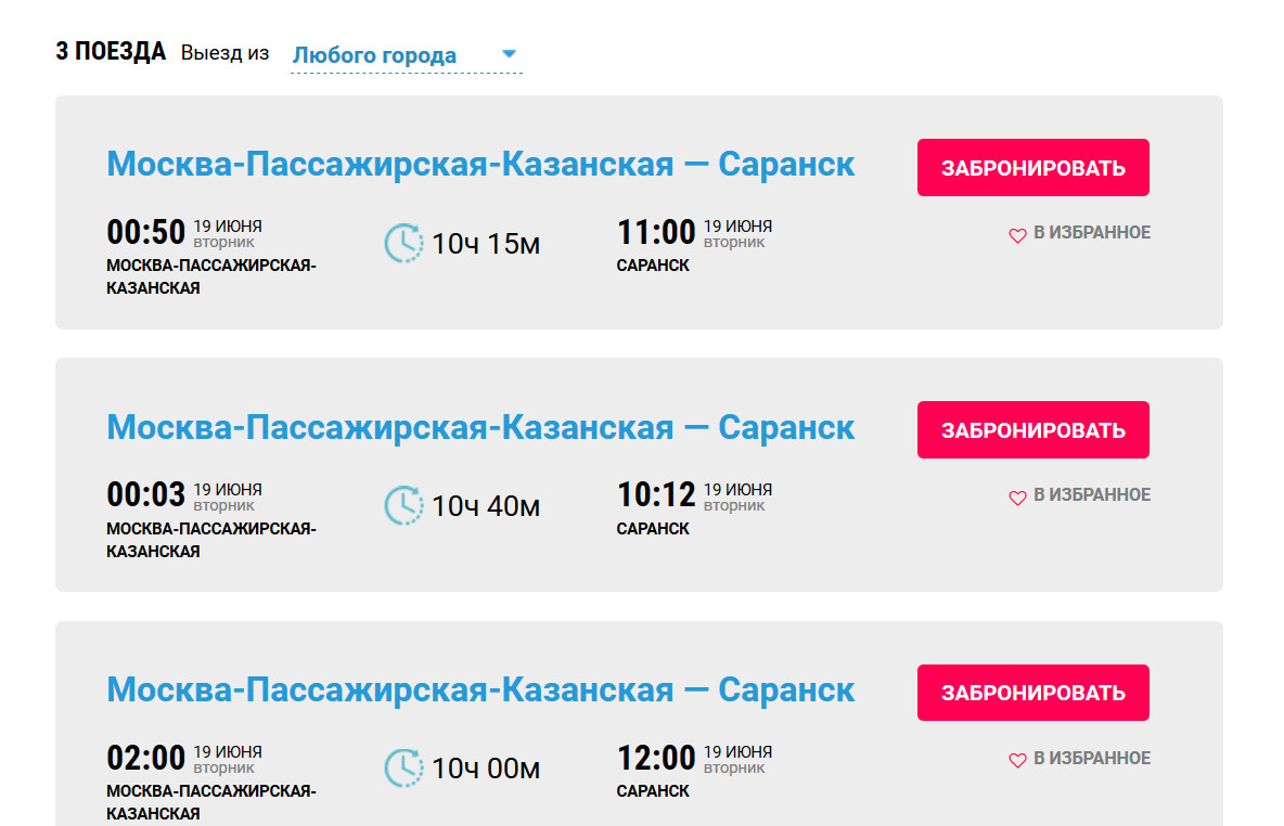 Выбираем нужный матч и видим все поезда, которые уже назначены на эту игру. Пока из Москвы их три и обратно тоже. Матч начинается в 15:00 по московскому времени, а, значит, расписание поездов туда очень удобно для болельщиков.