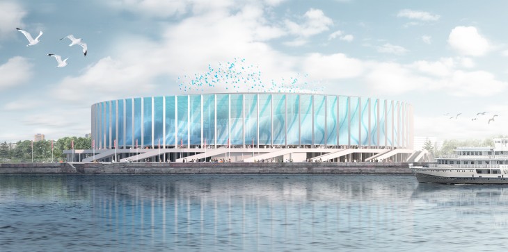 Спортивное сооружение возведено в живописном месте — на Стрелке — там, где река Ока впадает в реку Волгу. Это самый центр Нижнего Новгорода и, пожалуй, самое популярное место среди туристов.