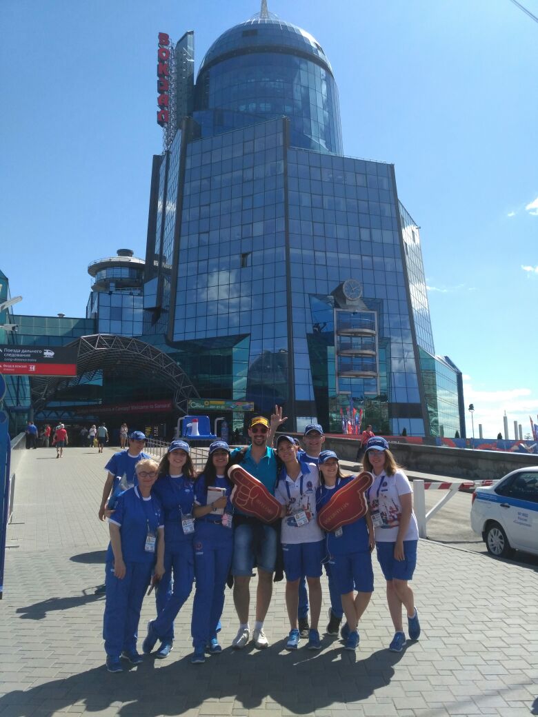 Самара встретила нас прохладной погодой, но с улыбкой. Это местные волонтеры поднимают настроение прибывающих болельщикам.