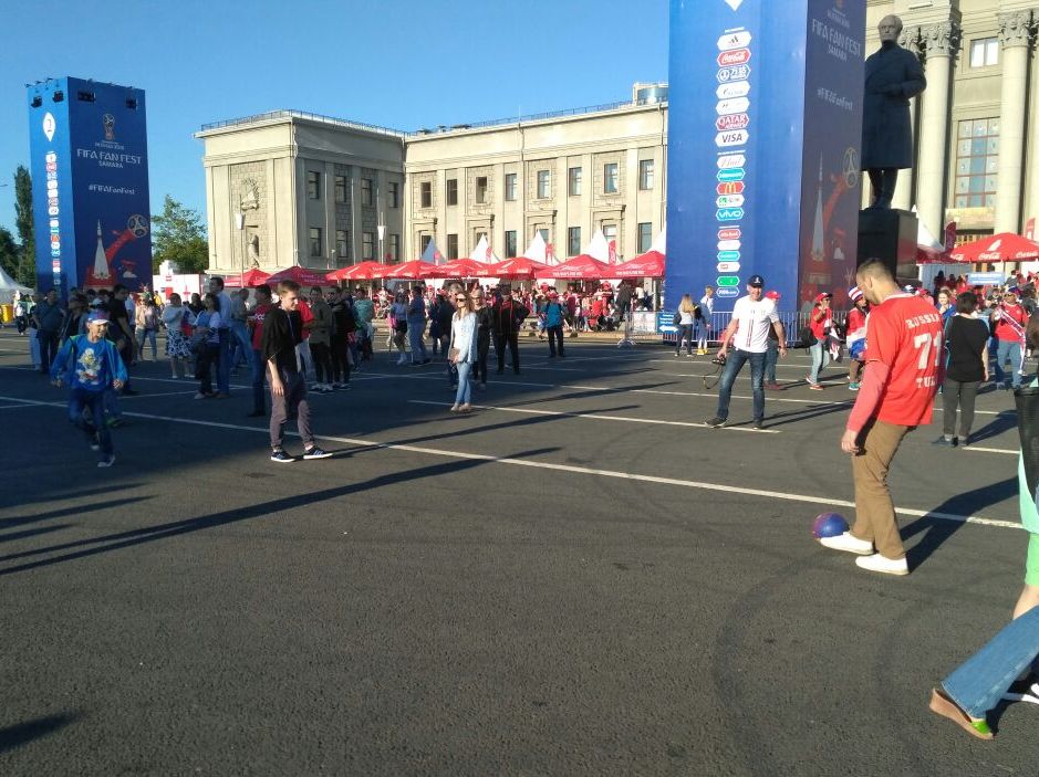 Возле и внутри бара уже собрались группы фанатов обоих сборных, чтобы повысить градус боления перед поездкой на стадион. Отдав дань продукции местного пивзавода и отведав плодов улова местных рыбаков, мы начали "всплытие" в направлении стадиона. Болельщиков из центра города до спортивной арены доставляли специальные бесплатные автобусы - шатлы. Ехать пришлось долго, около 40 минут. Затем ручейки из тысяч фанатов через парк потекли к новейшему стадиону, который Самаре подарил ЧМ-2018.