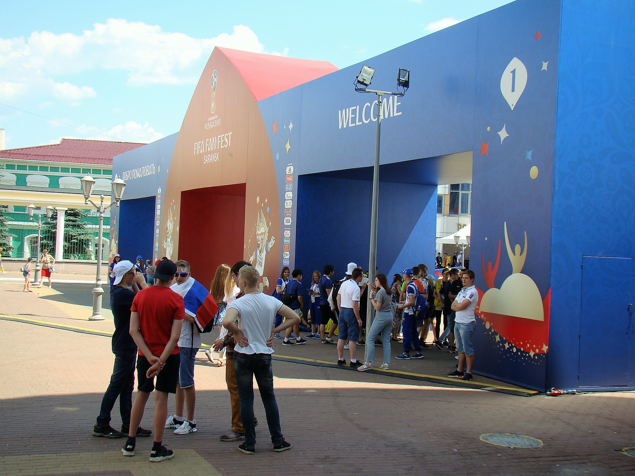 Единственная трудность – это попасть в кафе после матча. Все забито болельщиками. До матча Россия – Египет было много времени и поесть мы успели. Самый важный матч в нашей группе пропустить было нельзя и мы пошли в фан-зону, которая расположилась на центральной площади Саранска. Хорошо, что пошли заранее, потому что саранчане любят футбол и на входе была большая очередь. Досмотр тщательный, но, как и везде, дружелюбный.