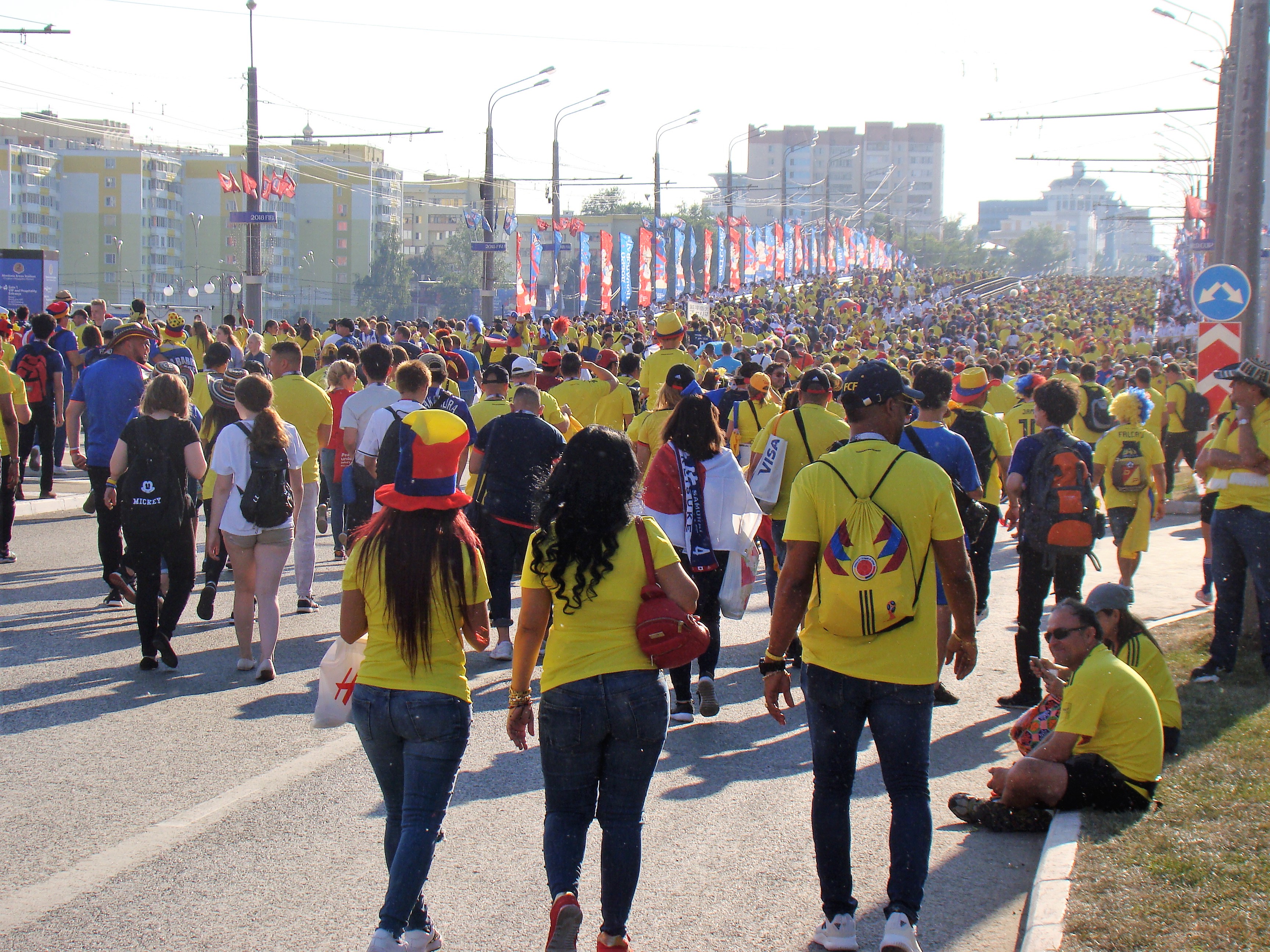 По рейтингу Саранск среди городов, принимающих ЧМ-2018, был на последнем месте. Но оказалось, что это очень приятный, чистый и добродушный город. Много новых домов, построенных к ЧМ-2018. Красивый оранжевый стадион, играющий на солнце. Желтизны в А колумбийские болельщики добавили еще больше ярких оттенков городу — Саранск буквально «перекрасился» в желтый. Смотришь на Коммунистическую улицу и кажется, что стоишь на поле цветущее мать-и-мачехой. Поле, говорящее на непонятном языке, поющее и орущее…