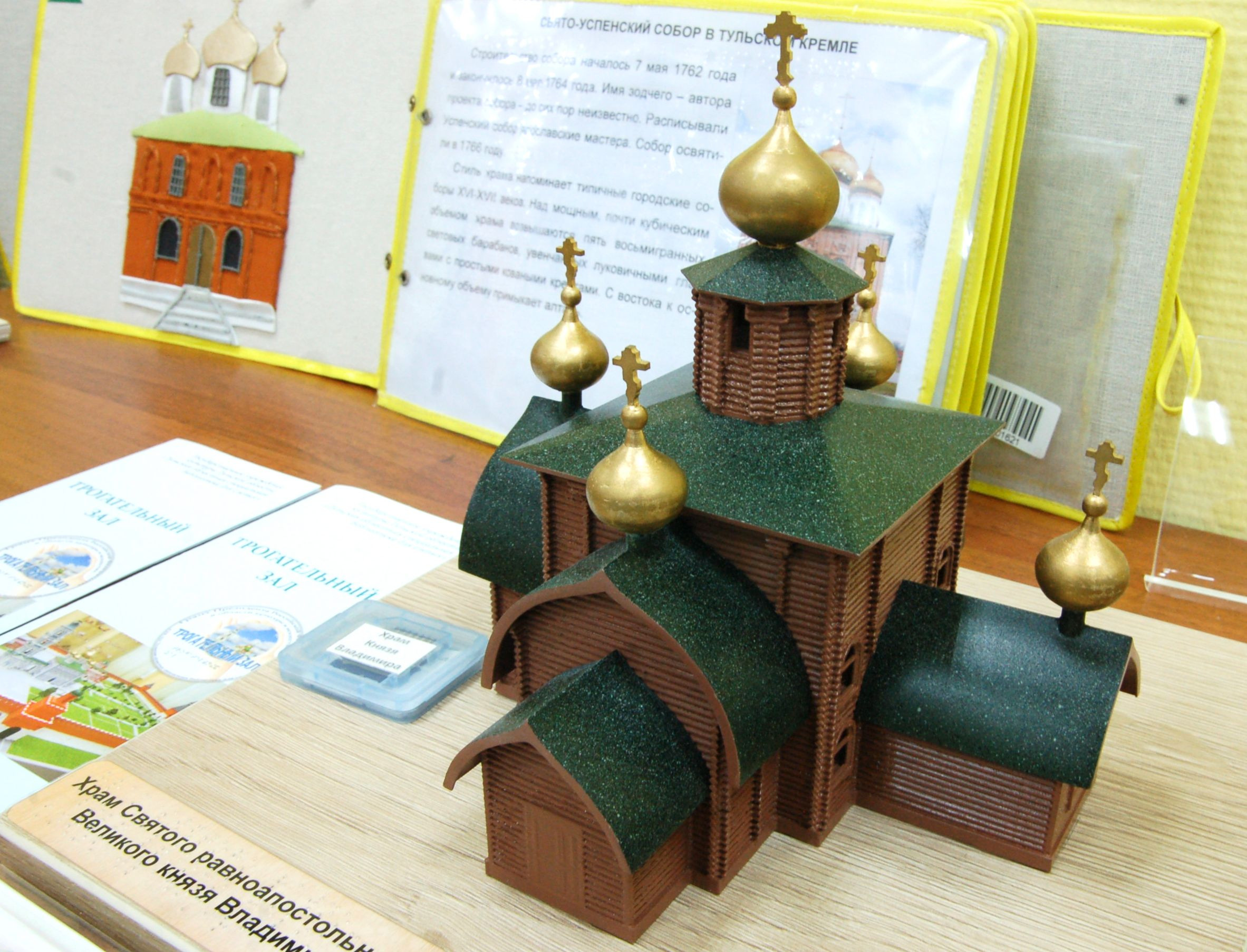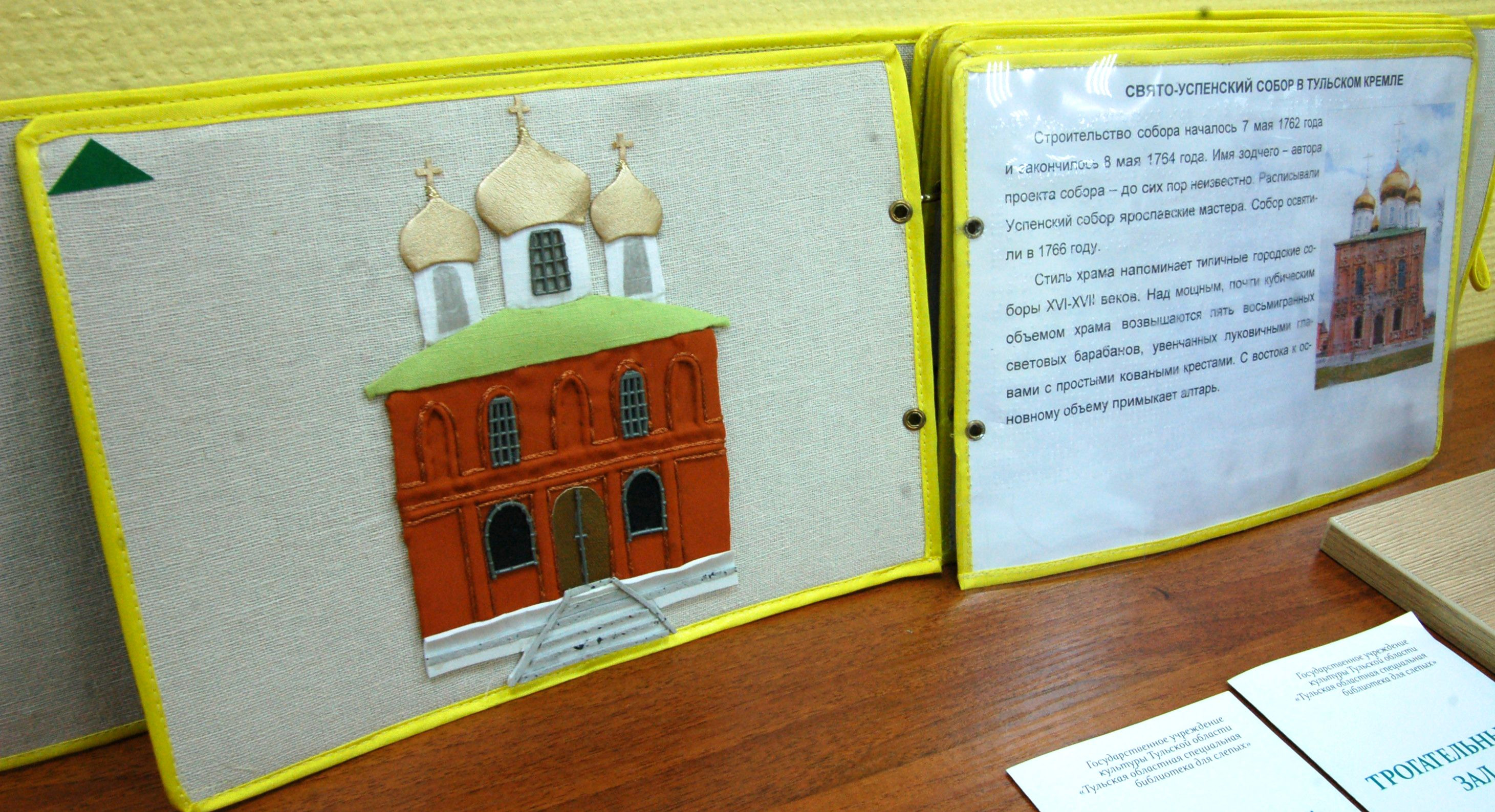 А это еще одно направление «трогательного зала». По мере роста интереса посетителей, было решено знакомить «особых» читателей и с наиболее интересными достопримечательностями Тульского края, и его брендами. В итоге появилась экспозиция макетов тульских храмов и целый ряд тифлокниг о них — и с увеличенным шрифтом текста для просто слабовидящих, и брайелевскими страницами, и, естественно, рельефными иллюстрациями. Кроме того, в стадии оформления стенды о белевском кружеве, тульском прянике...