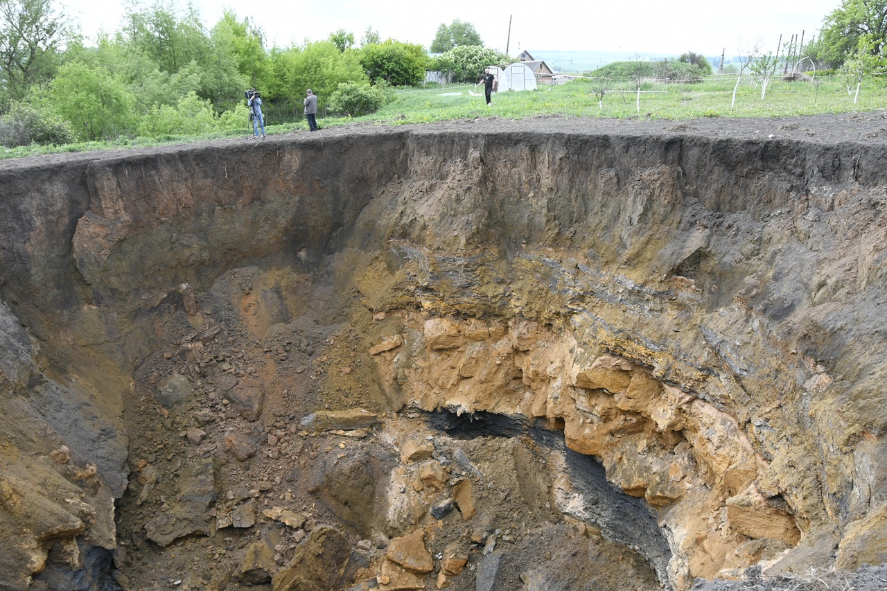 8 мая здесь произошел обвал грунта. Не где-нибудь в поле, а не территории частного домовладения. На месте огорода с грядками в одночасье появилась огромная дыра глубиной порядка 15 метров. Чуть ли не вдвое больше в диаметре.