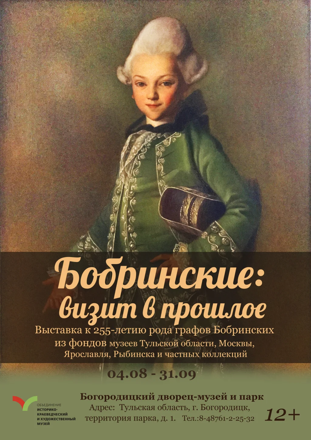 В 2017 году исполнилось 255 лет роду графов Бобринских. К этой знаменательной дате Богородицкий дворец-музей и парк подготовил выставку «Бобринские: визит в прошлое», где представлены предметы из собственных фондов музея, а также Тульского областного художественного музея, Историко-мемориального музейного комплекса «Бобрики», Государственного музея А. С. Пушкина, Ярославского художественного музея, Рыбинского государственного историко-архитектурного и художественного музея-заповедника и частных коллекций. Всего в экспозиции зрители увидят порядка 60 работ графики, живописи, декоративно-прикладного искусства.