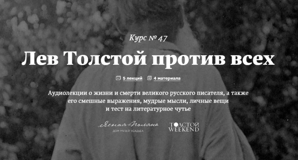 Этот курс – одна из онлайн-активностей, созданных в поддержку театрального фестиваля Толстой Weekend, который проходит в Ясной Поляне с 2016 года по инициативе губернатора Тульской области Алексея Дюмина, при поддержке Министерства культуры Российской Федерации и госкорпорации «Ростех». Этим летом в преддверии фестиваля мы уже рассказывали (http://arzamas.academy/mag/444-tolstoy) о том, как Лев Толстой стал героем поп-культуры и попал в мемы, книги Сорокина и Пелевина, сериал про Индиану Джонса и даже на иконы.