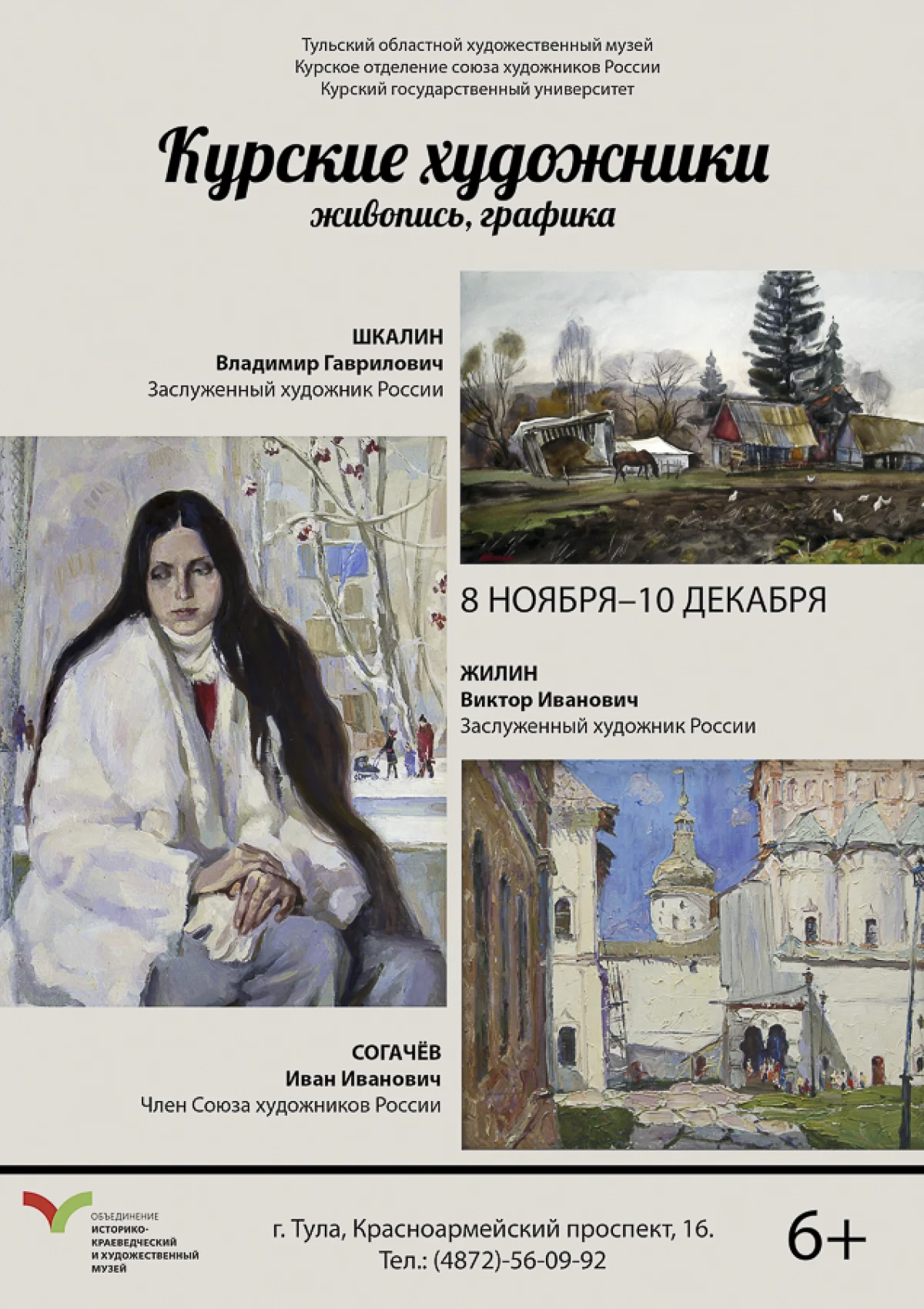 В рамках обмена художественными выставками между городами центральных областей России в Выставочном зале состоится открытие выставки произведений мастеров изобразительного искусства г. Курск – художников В. И. Жилина, И. И. Согачева, В. Г. Шкалина. Организаторы выставки – Тульский областной художественный музей, Курское отделение Союза художников России, Курский государственный университет.