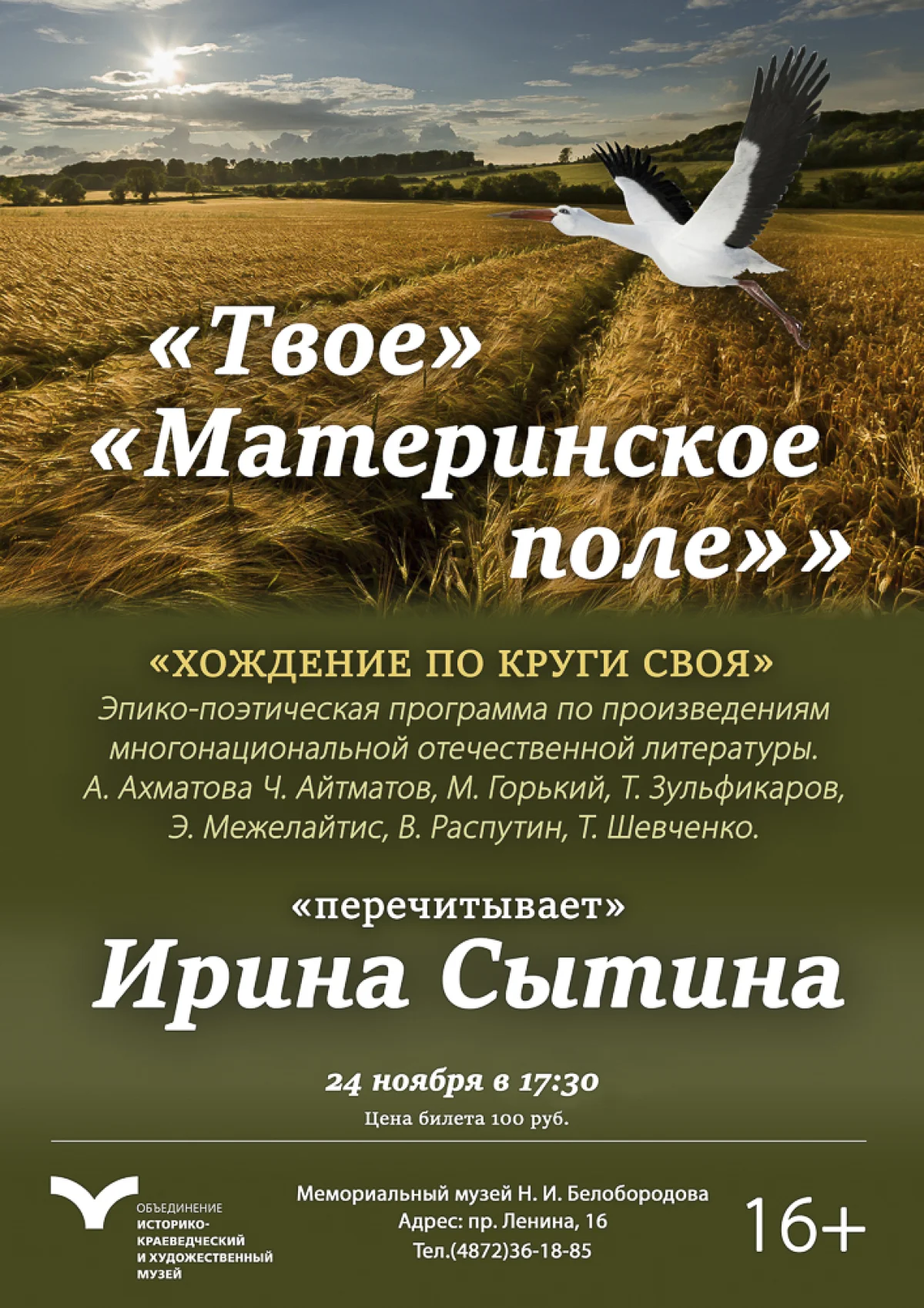 24 ноября в 17:30 мемориальный музей Н. И. Белобородова приглашает на программу Ирины Сытиной «Твое "Материнское поле" (Хождение по круги своя)»