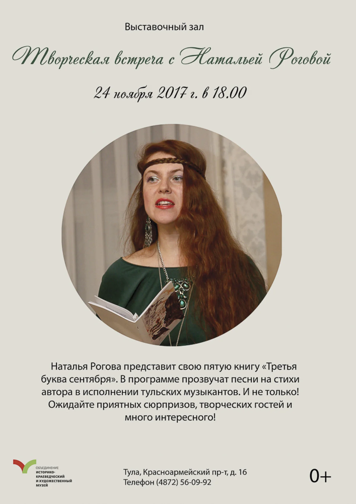 На творческом вечере в Выставочном зале поэтесса представит свою пятую книгу «Третья буква сентября». В программе прозвучат песни на стихи автора в исполнении тульских музыкантов. И не только! Ожидайте приятных сюрпризов, творческих гостей и много интересного!
