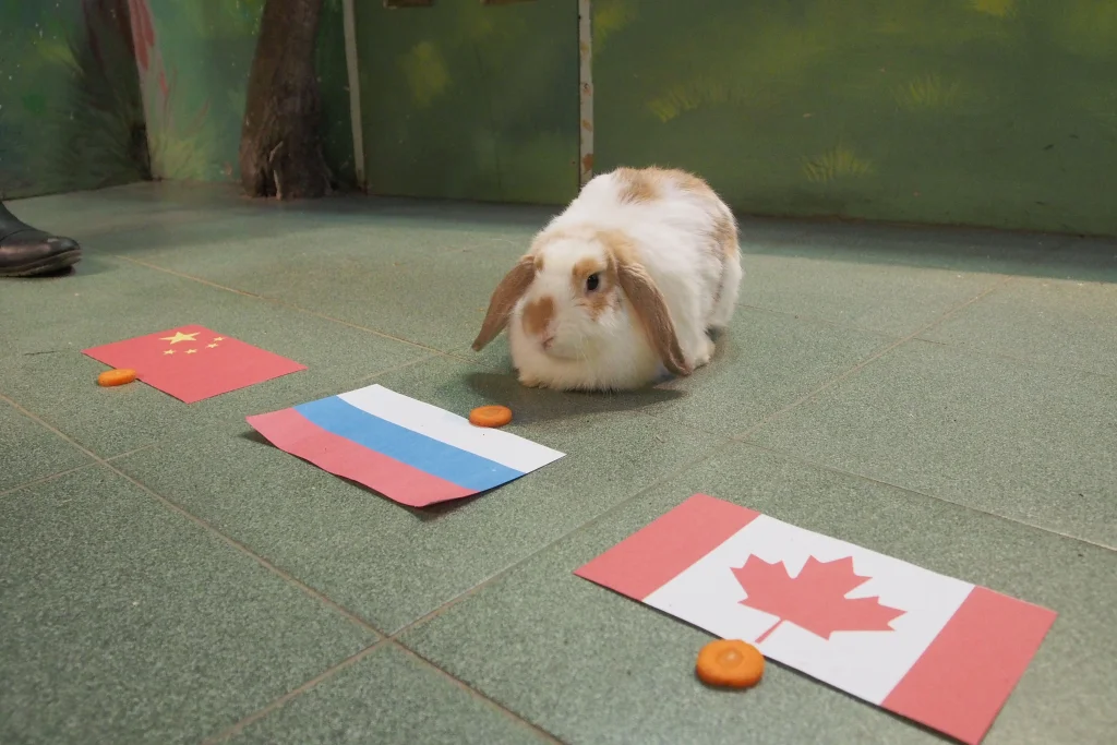 Второй проявить свой дар предсказания позволили прекрасной блондинке — крыске Сочи. Актуальное имя, не правда ли? Как и положено даме, Сочи смущенно прогуливалась по углам «поля предсказания». Наконец, томно опустив красные глаза, присела на флаг Канады.