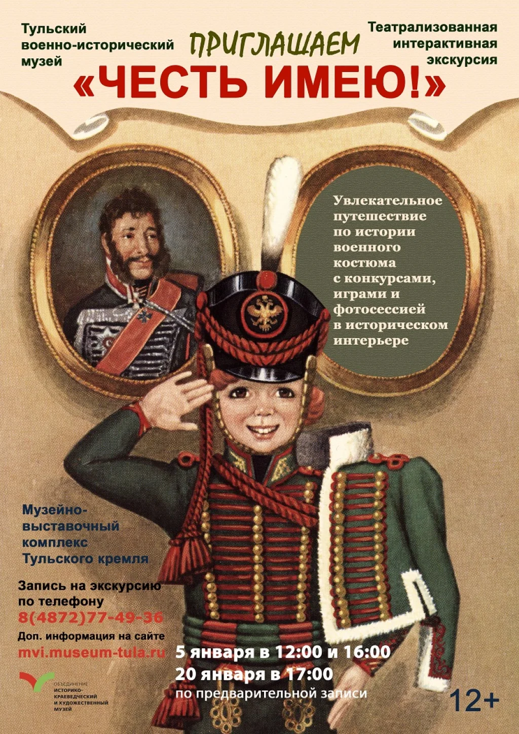 Вместе с бывалым солдатом-барабанщиком вы отправитесь в путешествие по разным эпохам и узнаете историю русского военного мундира. Участникам расскажут, что такое гренадерка, кто носил кивер и почему солдаты отказались от пикельхельма. Гостей ожидает захватывающая экскурсия по многовековому военному быту, конкурсы, игры и фотосессии в историческом интерьере. Приходите! Скучно не будет!
