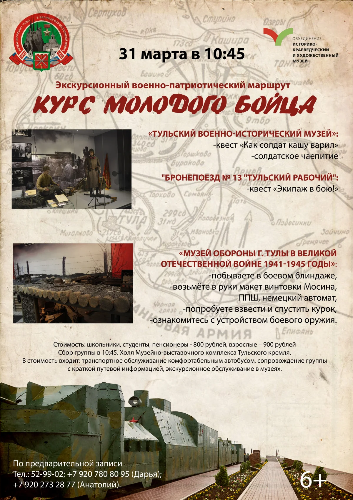 Следующей остановкой в маршруте станет легендарный бронепоезд №13. Построенный осенью 1941 года туляками-железнодорожниками и мастерами-оружейниками, он оказался поистине уникальным творением тульских мастеров. Подобной боевой машины не было во всей истории Великой Отечественной войны. Участники маршрута посетят базу дивизиона (вагон-клуб, вагон-пекарню, штабного вагона, а также боевую часть (бронепаровоз, бронеплощадки, контрольные платформы с орудиями), где воссоздана боевая обстановка. Под сигналы воздушной тревоги, грохот от разрывов снарядов гости перенесутся в атмосферу боя! Их ждёт НОВОЕ занятие «Экипаж - в бою!», который проводится на бронепоезде «Тульский рабочий». Вы окажетесь в незабываемом историческом интерьере и совершите здесь увлекательное путешествие по страницам истории тульских железных дорог! Участникам предстоит выступить в роли бойцов пулеметного расчета. Но чтобы получить патроны и набить пулеметную ленту, нужно выполнить множество разнообразных заданий в вагонах бронепоезда. Приходите и продемонстрируйте ловкость, смекалку и эрудицию, докажите, что способны стать достойным бойцом экипажа.