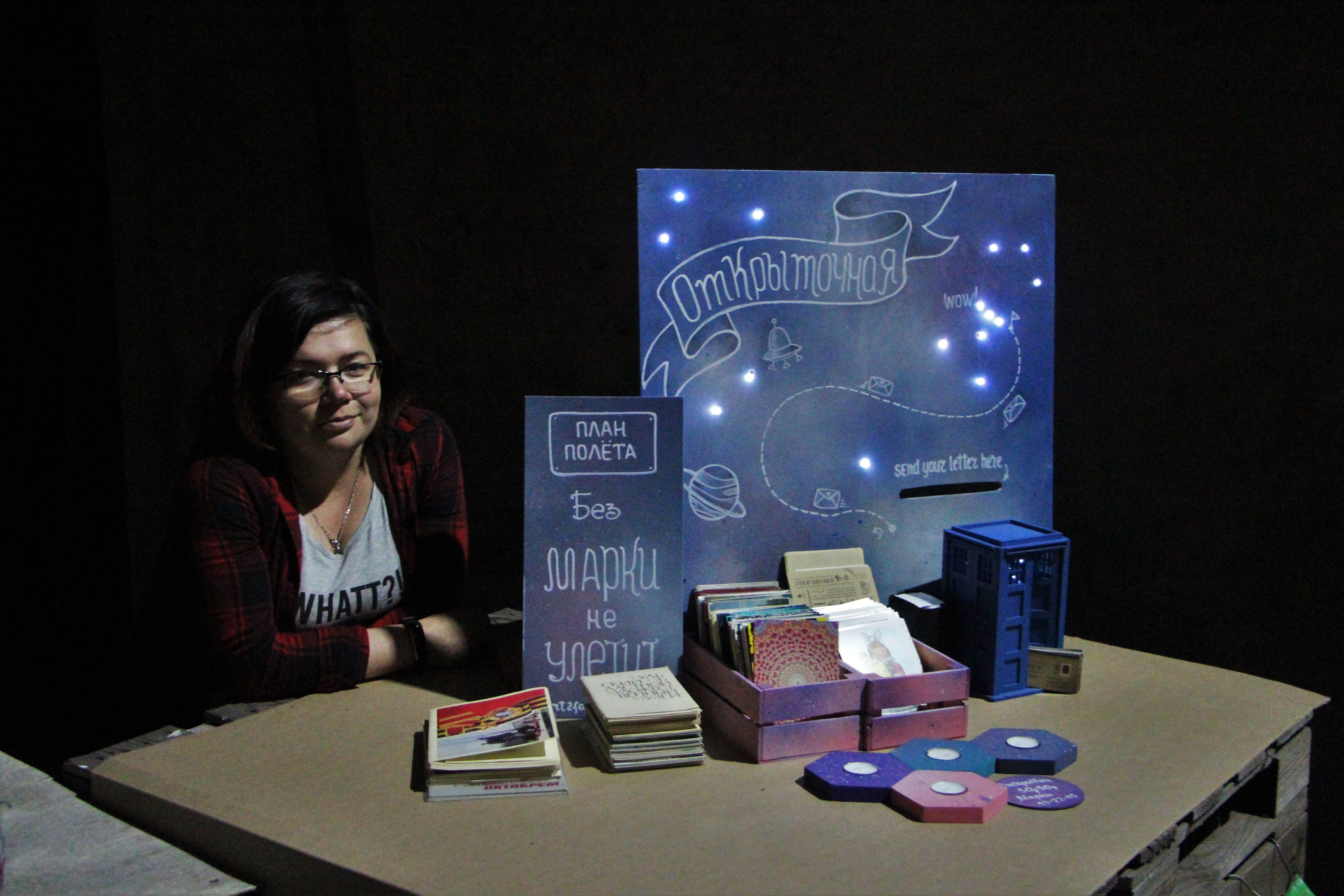 На одной из интерактивных площадок гостям фестиваля предлагали закрепить на скрепку кусочек старого журнала и повесить над крышей, на другой можно было купить открытку и отправить ее.