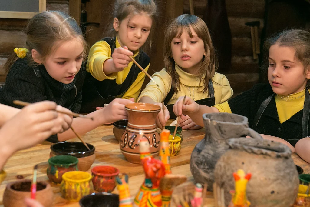 В гончарной мастерской можно познакомиться со старинными способами лепки горшков, самостоятельно слепить маленький сосудик, поговорить о филимоновской игрушке и особенностях её орнамента, а в конце закрепить полученные знания в росписи петушка.