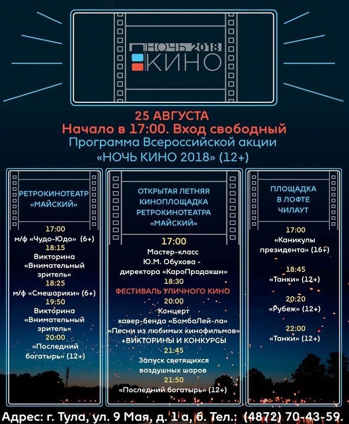 Приглашаем туляков и гостей города на праздник! С «Ночи кино» никто не уйдет без ярких воспоминаний, которые сохранятся на целый год!Вход бесплатный. Возрастная категория 12+. Мероприятие проводится с 17:00 до 24:00. Ждем гостей с по адресу: ул. 9 Мая, д.1 «а».Телефон для справок: 704-359.
