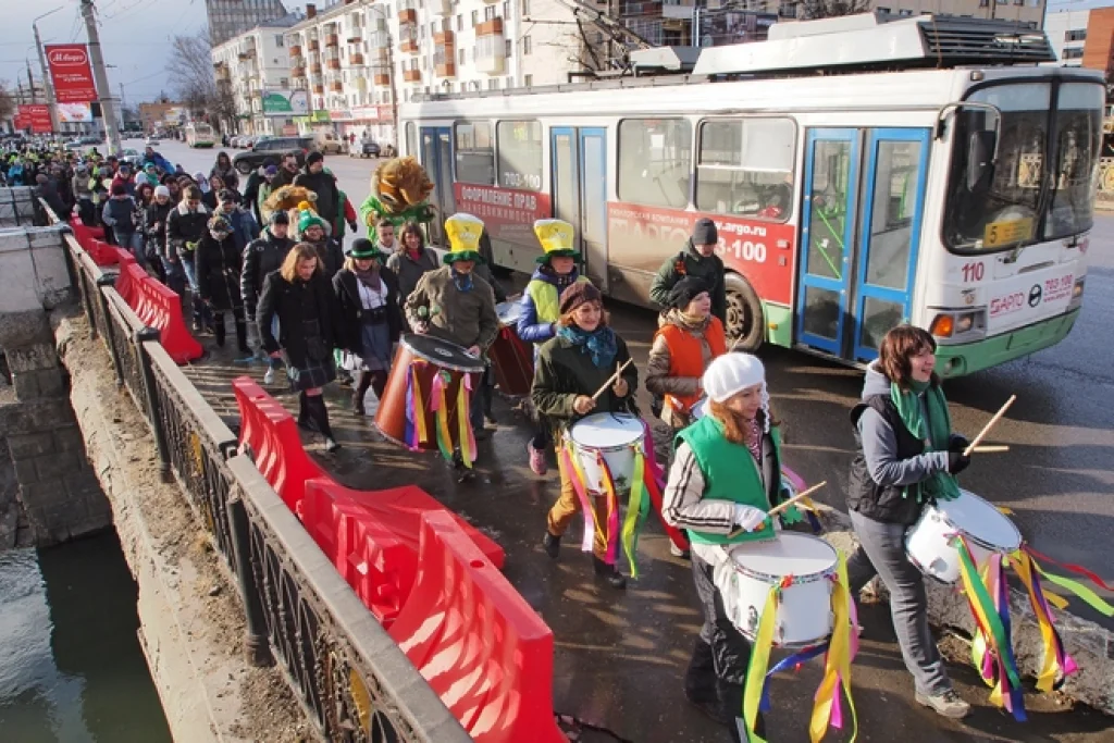 Карнавальное шествие началось от торгового центра «Сарафан». Собравшиеся волынщики, музыканты, барабанщики прошли по улице Дмитрия Ульянова до ДК Железнодорожников, где участников ждал Международный Фестиваль ирландской музыки и танца.