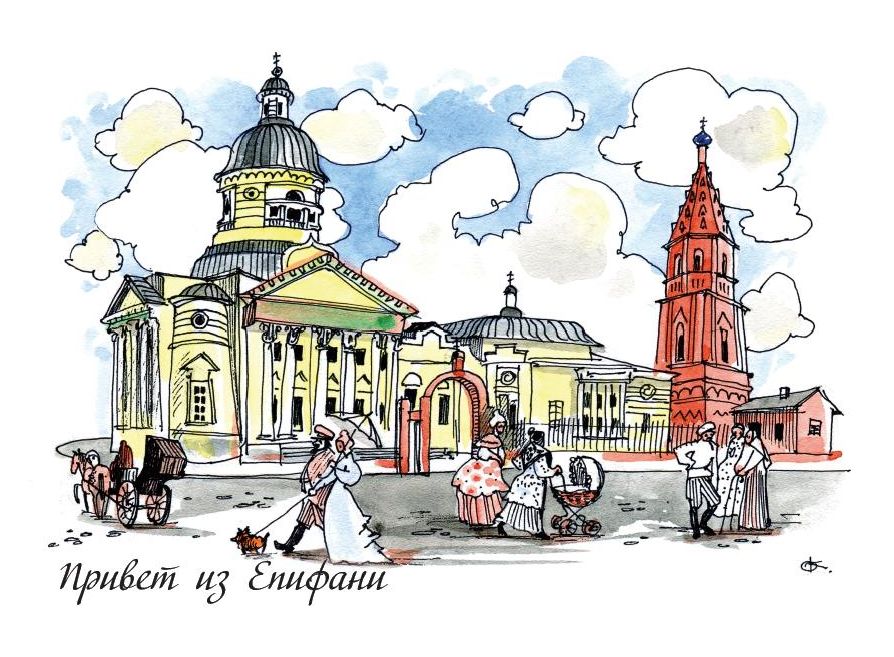 Передать уютную атмосферу Музея купеческого быта и образы ушедшей в прошлое, но не забытой Епифани помогла тульская художница Оксана Кагальникова. Яркие моменты экскурсий и музейных событий, милые образы епифанских жителей благодаря ей запечатлены в акварели и воспроизведены на почтовых карточках. И, конечно, нашлось место на открытках главному символу Епифани – Никольскому собору.