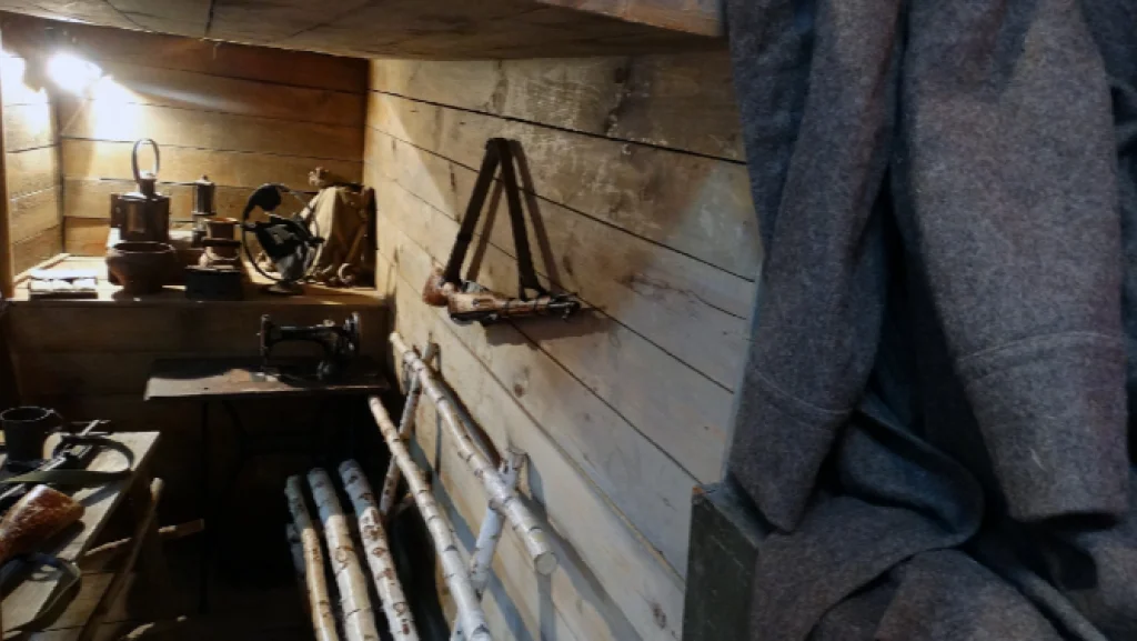 Интерактивная часть музея представлена макетом блиндажа, заглубленным ниже уровня пола. Каждый желающий может спуститься в него, взять в руки знаменитый ППШ или винтовку Мосина, ощутить на себе тяжесть солдатской каски.