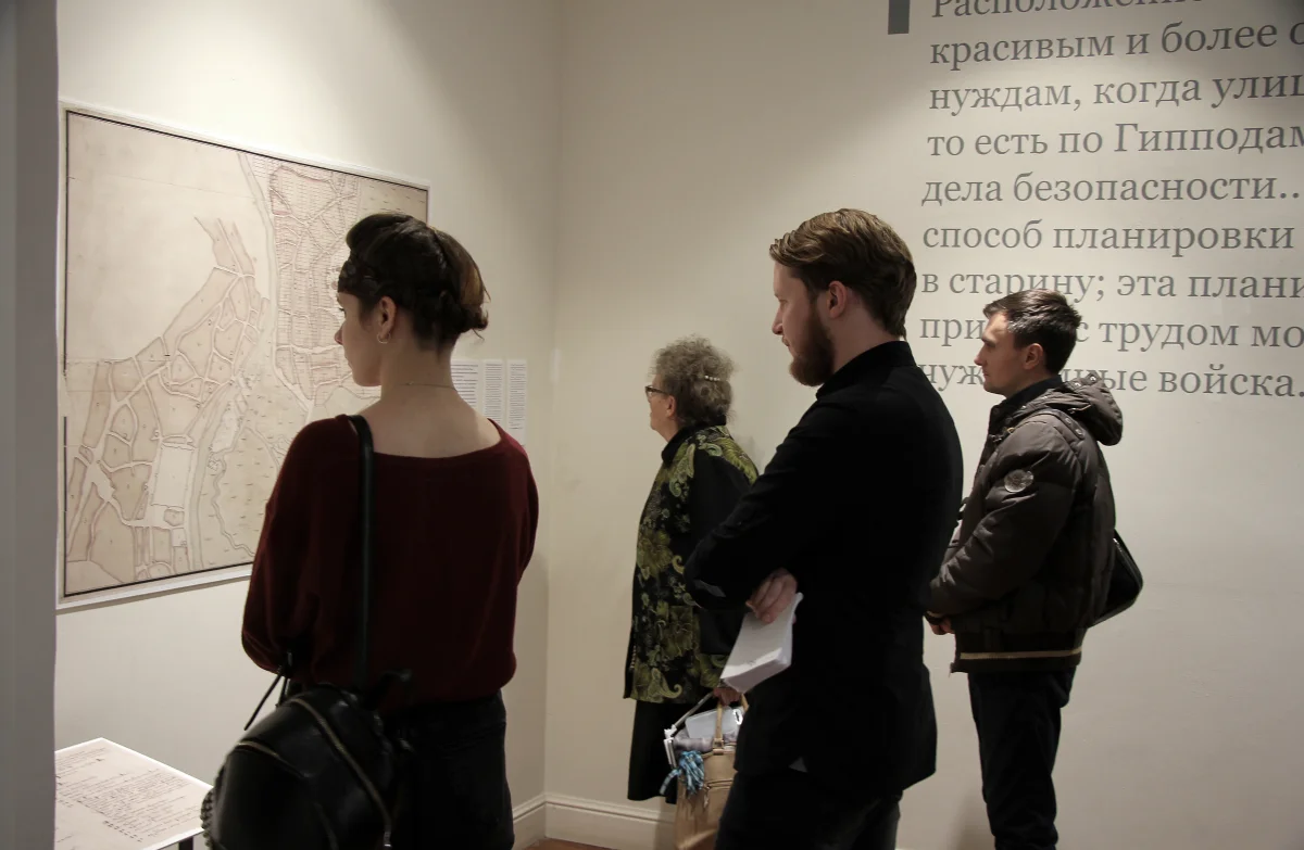 Зная, что смотреть только на планы и чертежи будет скучновато, мы решили сделать акцент в экспозиции на текстах: рядом с каждым изображением есть подробный (местами ироничный, местами – беспримесно философский) комментарий культуролога Вадима Касаткина и текстовые гиперссылки о людях, событиях, проектах, которые упоминаются в этих комментариях.