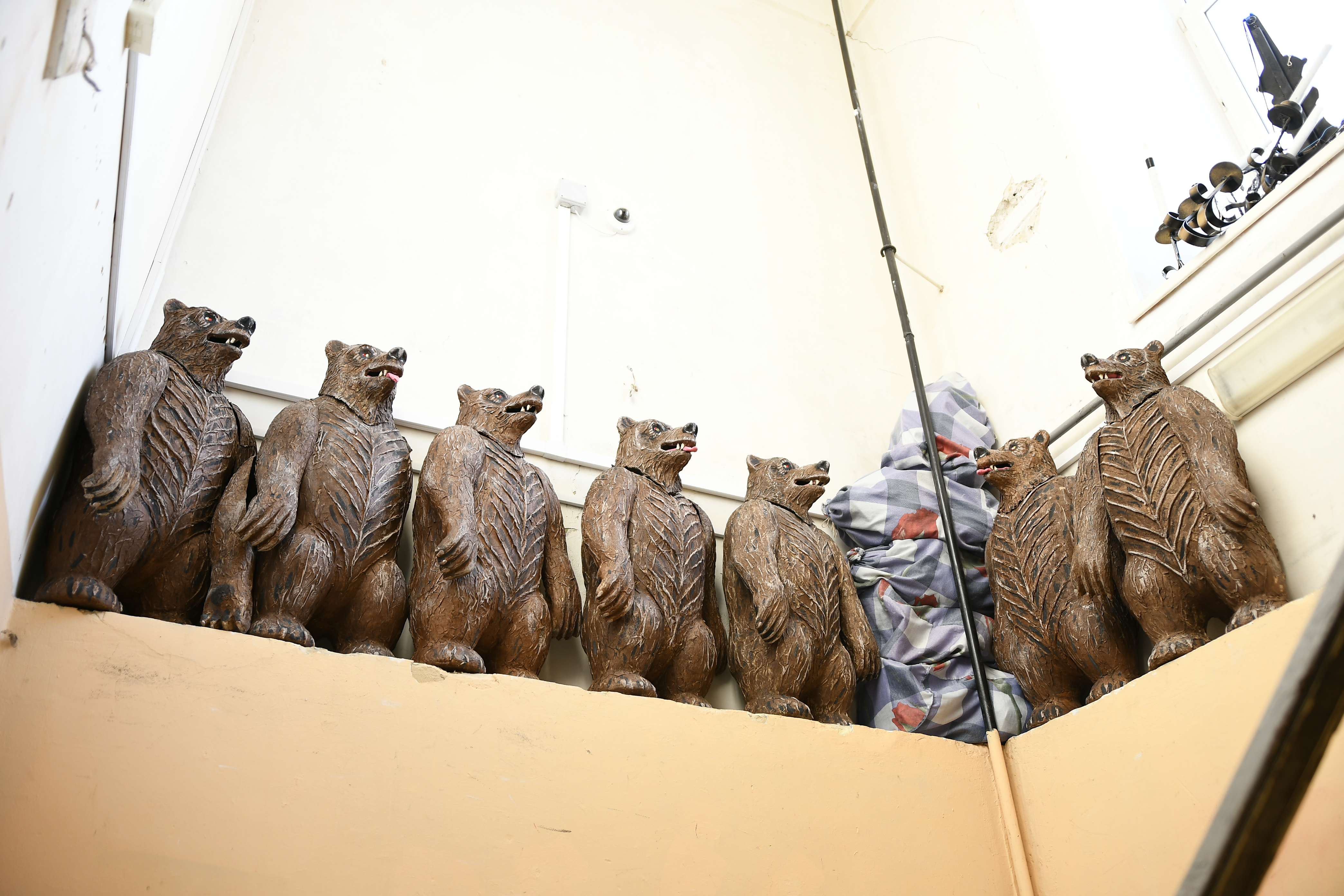 встречают куклы из спектакля «Золушка». А над лестницей, ведущей к сцене, разместились забавные медведи