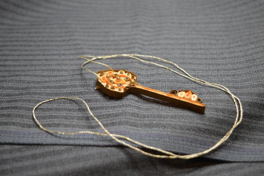 По мотивам выставки «Ключ сильнее замка» мастер Екатерина Зернова предлагает создать необычную брошь. На этот раз золотой ключик будет сделан из скрученных в спирали полосок бумаги – в технике квиллинг. Искусство бумагокручения поможет передать ажур кованных изделий. Более ярким и интересным работу сделают декоративные бусины.