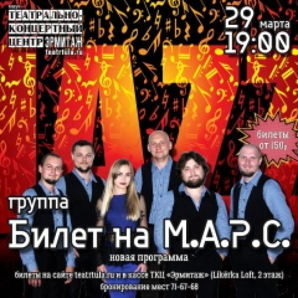 29 марта в 19.00 в зале Театрально-концертного центра «Эрмитаж» состоится весенний концерт «Джаз по-русски» группы «Билет на М.А.Р.С.».