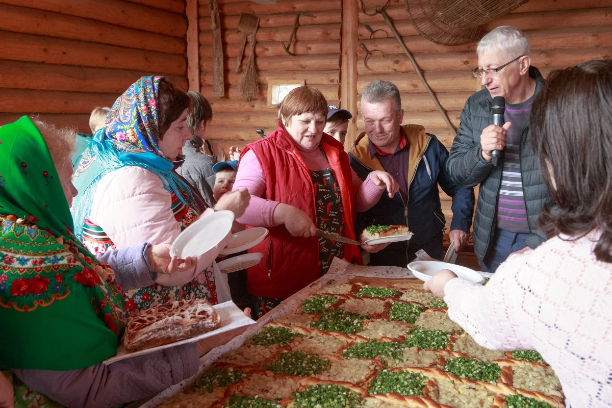 В завершении праздника подали громадный луковый пирог. Как шахматная доска, он был украшен различными луковыми начинками. Для соблюдающих пост – луковый мармелад и жареный лучок, остальным – зеленое крошево перьев лука с яйцом. Пятидесятикилограммовое угощение смели в считанные минуты. Еще один миниатюрный, по сравнению с первым, яблочный пирог также поделили на всех. Он стал символом будущего фестиваля «Сад-Палисад», который пройдет со вкусом яблок.