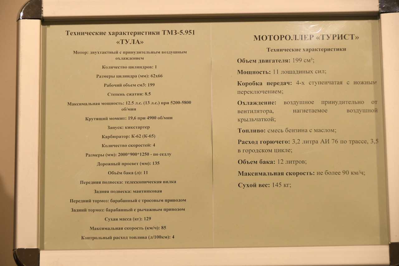 Гости выставки могут увидеть подлинный мотороллер «Турист» и мотоцикл «Тула». Самые юные гости могут даже почувствовать себя в роли мотолюбителя и посидеть в сёдлах мотоциклов, примерив экипировку.