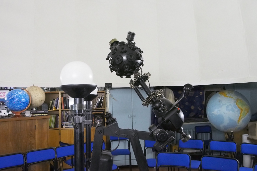 Небольшая комната, заставленная глобусами и увешанная звездными картами. На столах – макеты и модели планет, детские рисунки, какие-то хрупкие стеклянные приборы неизвестного назначения. Над всем этим космическим великолепием расположился шестиметровый купол, в центре которого стоит оптический проектор. Он-то и создает ту самую звездную атмосферу. Кажется, ещё немного, и можно будет протянуть руку и смахнуть все звезды себе в карман, как хлебные крошки со стола.