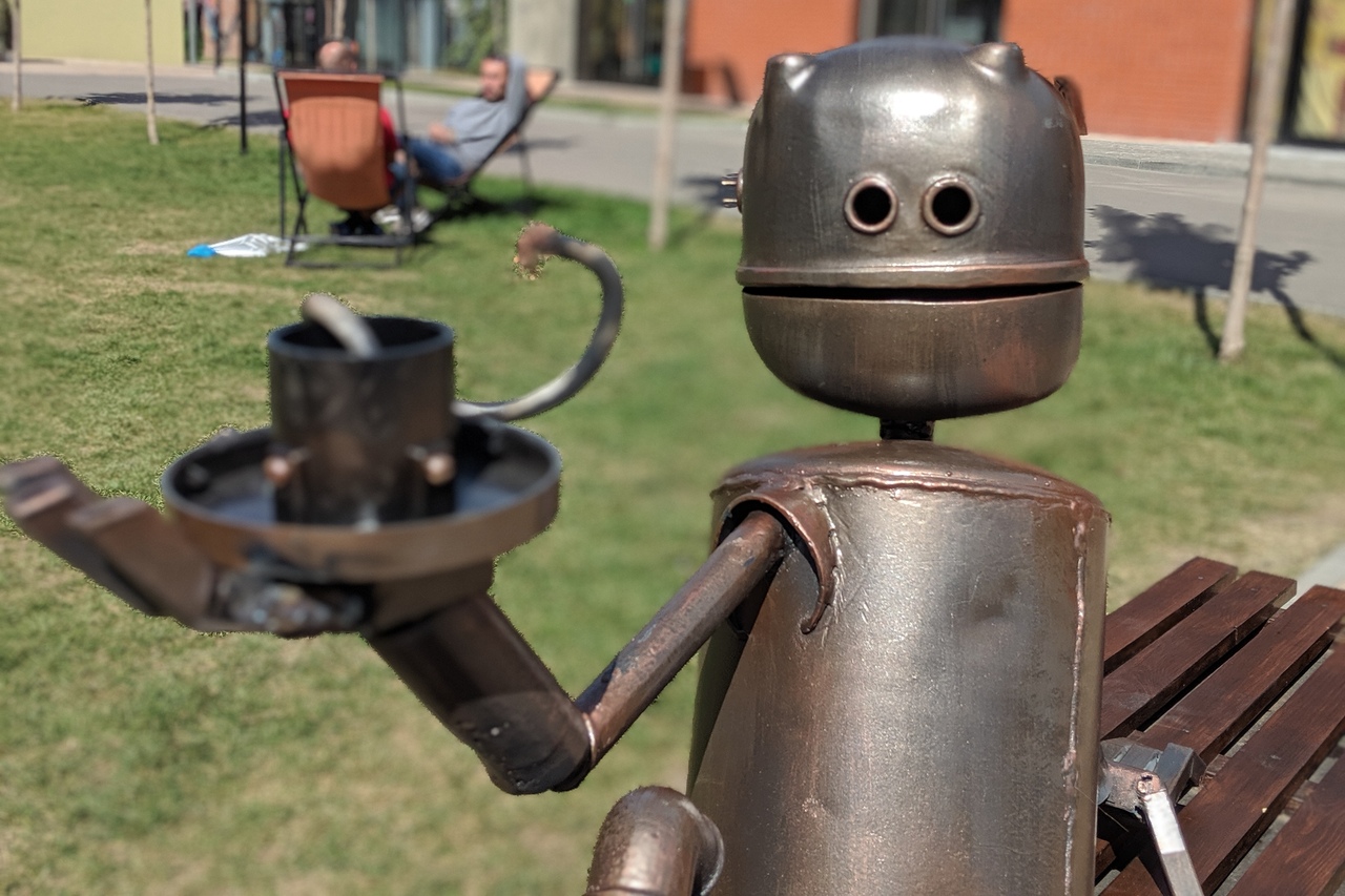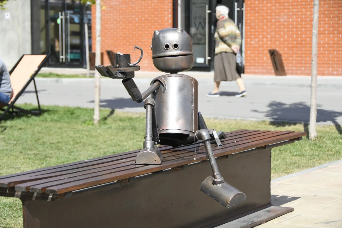Всего на «Искре» появилось три железных робота, все они расположились рядом с шезлонгами. Двое человечков сидят на лавочке, а один держит в руках цветочный горшок.