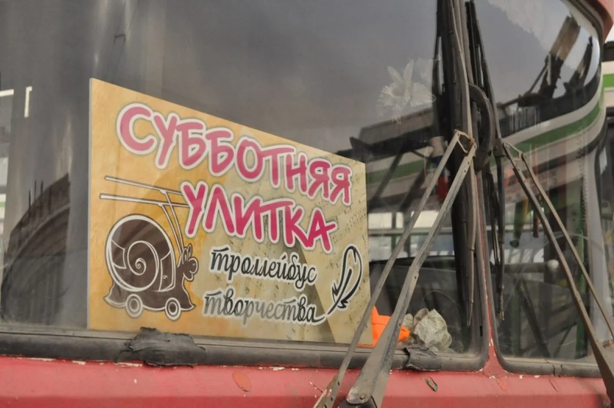 Творческий салон на колесах называется «Субботняя улитка». Почему «субботняя» - понятно: рейсы по субботам. А «улитка» - потому что троллейбусы люди называют «рогатыми» и часто жалуются на то, что они