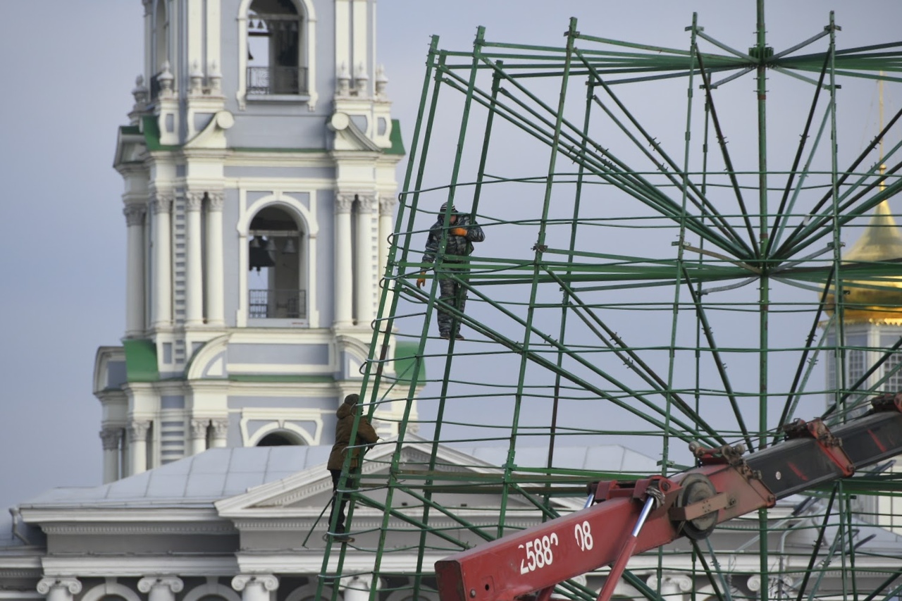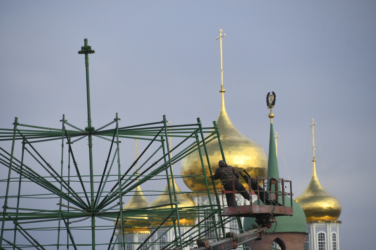 В Туле на главой городской площади начали устанавливать новогоднюю красавицу — 32-метровую елку.