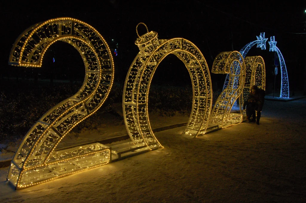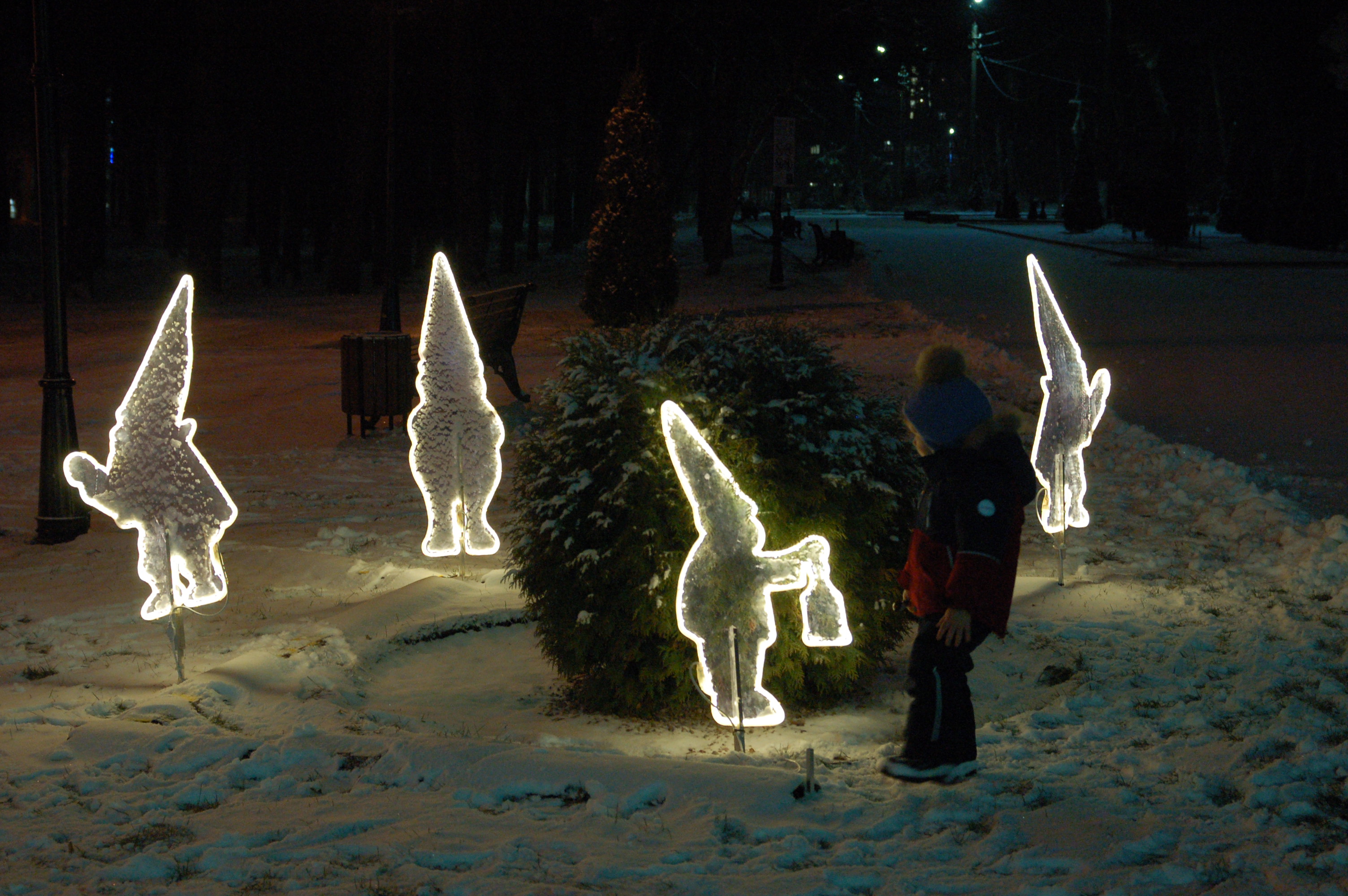 Рябиновую аллею украшают 12 трехметровых «падающих звезд» и композиция «2020», а площадь большого круга — арки в виде елочных шаров и аэрофигуры «Дед Мороз и Снегурочка». Рядом — большие световые коробки с подарками. В сквере «Мама и малыш» расположилась целая семья из восьми гномов.