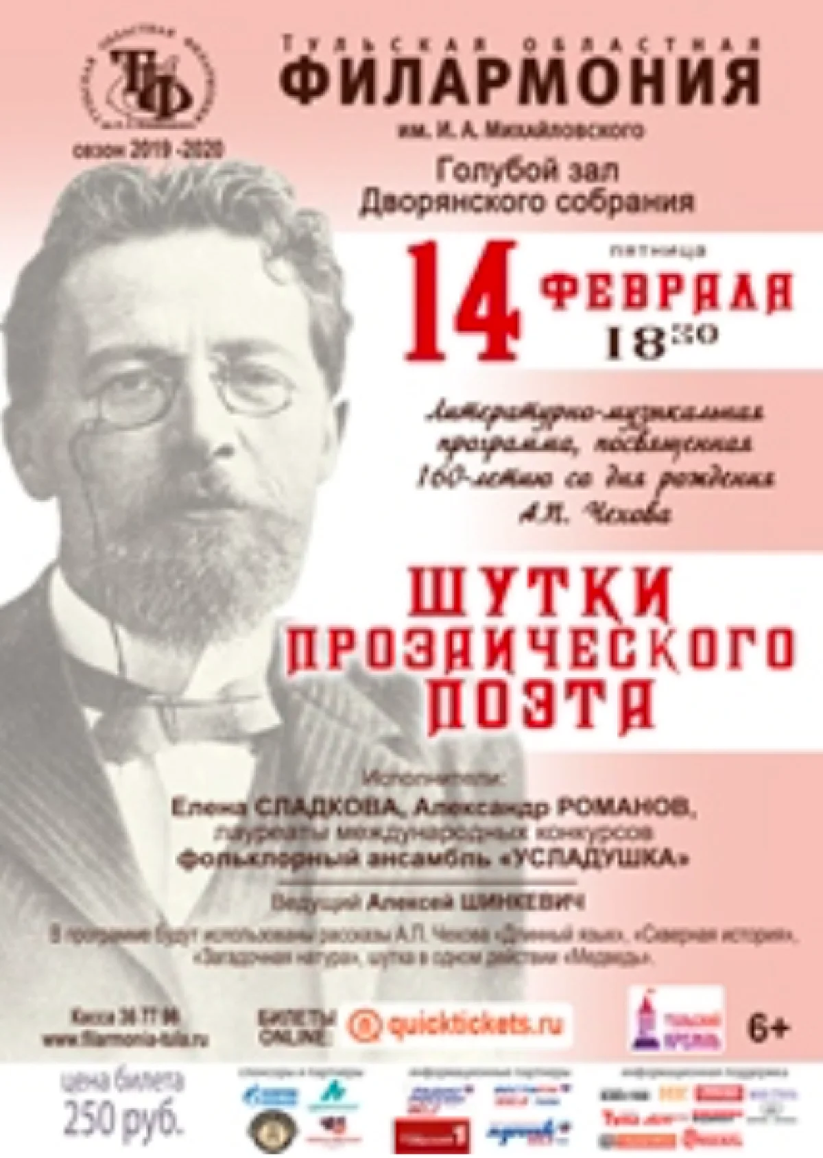 14 февраля в Голубом зале Дворянского собрания пройдет литературно-музыкальная программа, посвященная 160-летию со дня рождения А. П. Чехова «Шутки прозаического поэта». «Прозаический поэт» был одним из 50 псевдонимов писателя, которыми он подписывал свои ранние произведения.