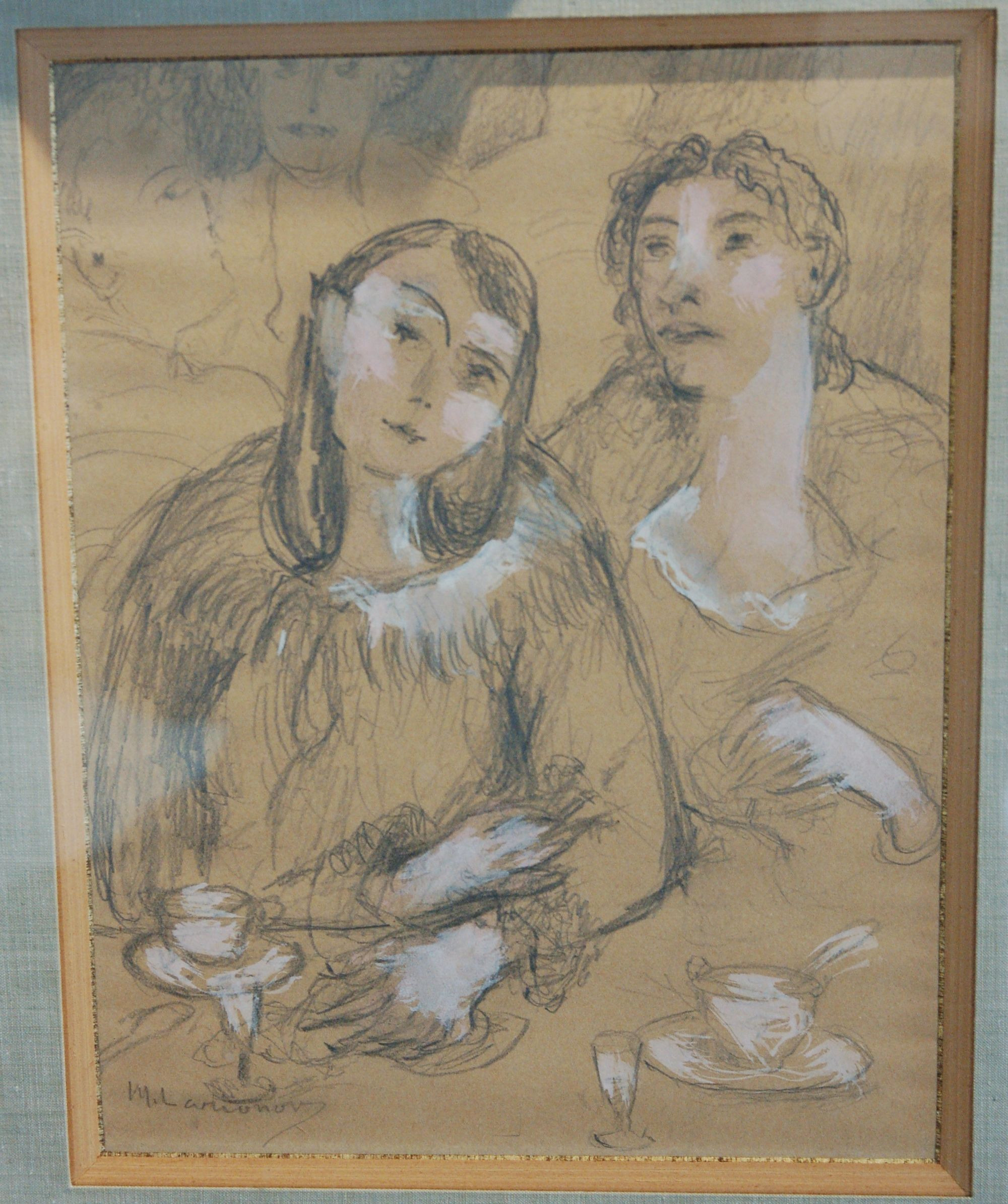 До нынешнего момента в экспозиции ТМИИ не было ни одной работы Михаила Ларионова, однако, есть натюрморт, написанный его женой — уроженкой Тульской области Натальей Гончаровой, родственницей жены самого Пушкина. Работы эти пересекаются — у художницы в композиции с персиками есть изображение одного из рисунков Ларионова, а на его графической картине, предположительно, одна из двух женщин — как раз сама Наталья.
